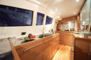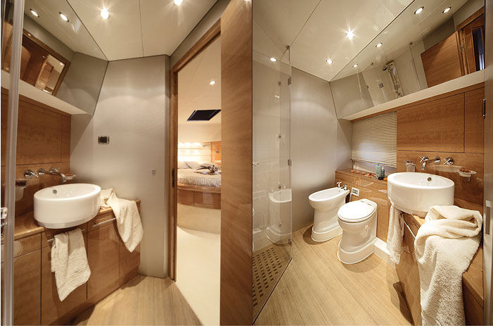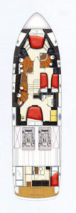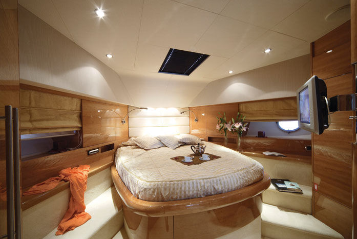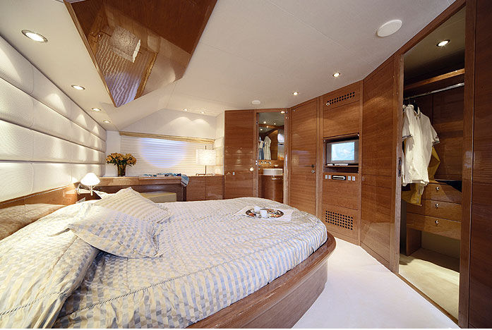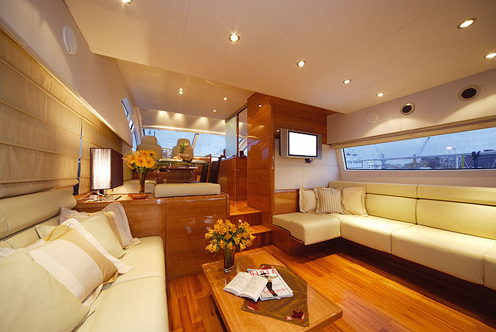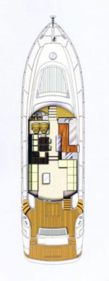 Forthright character, simple straight lines and new styling are the qualities that distinguish her. The spacious flying bridge with all the latest comforts, the saloon, the dining area and the fully outfitted galley meeting all culinary needs, and the four luxury staterooms guarantee maximum enjoyment of the pleasures of seafaring.