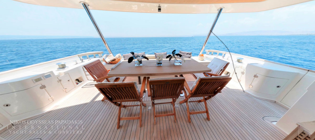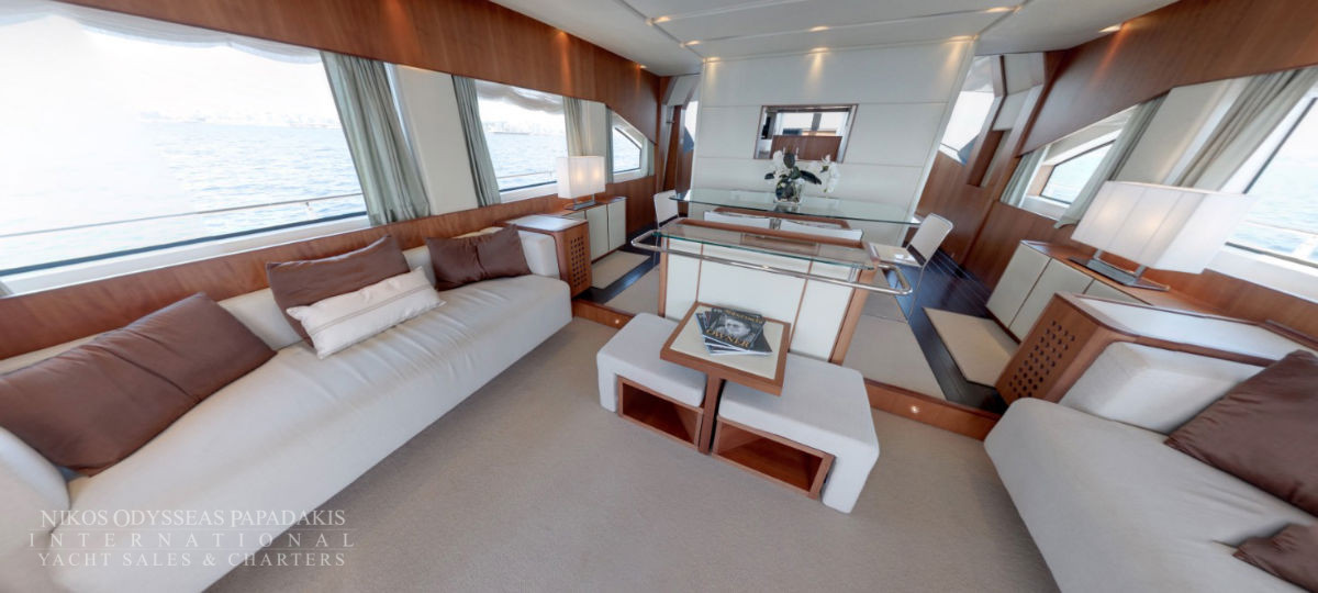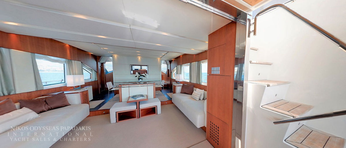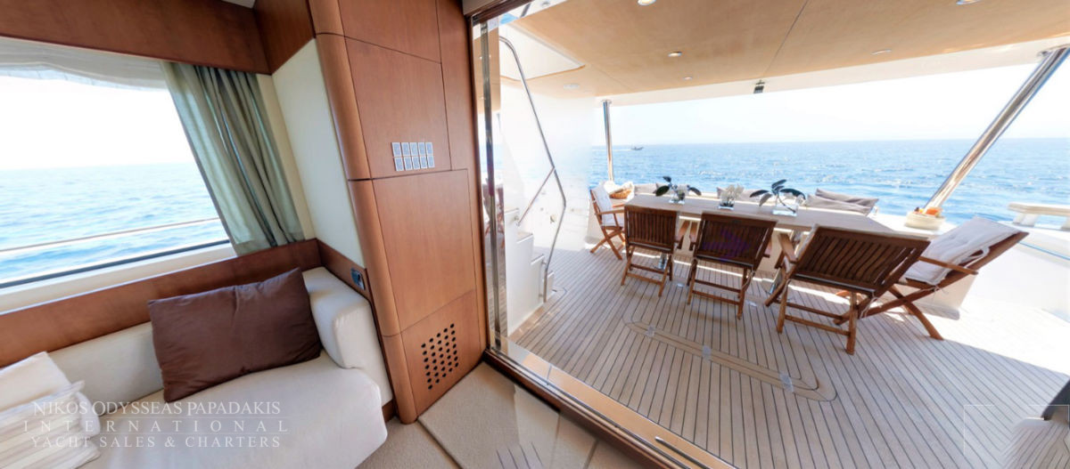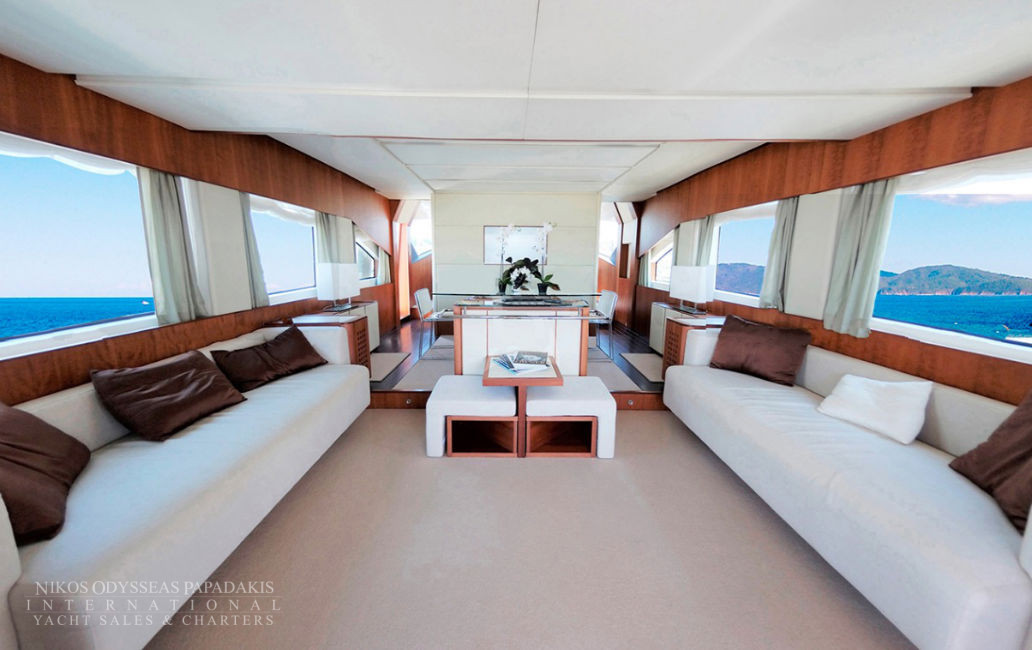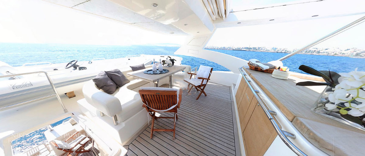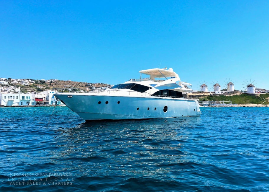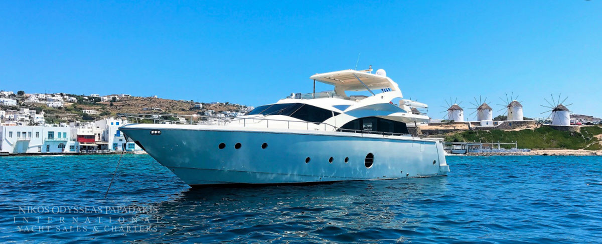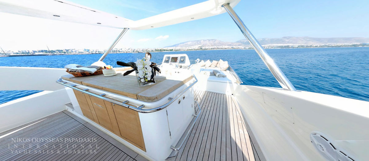 Aicon 77 Fly available for charter. One of the most ideal luxury charter yachts in Greece. A combination of special features offering accommodation for 8-10 Guests in four luxurious cabins. The talented CHEF will make your cruise a culinary experience! Aicon 77 Fly features A fantastic JACUZZI Spa Pool on fly bridge.