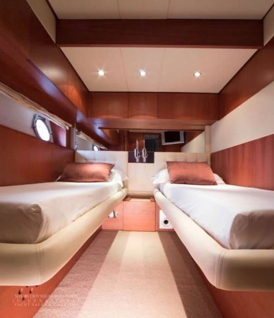 - Two almost identical Twin cabins convertible* to two Double with King sized beds (1.86cm width), which can sleep 3-4 small kids each.