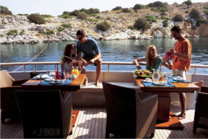 The charterer will be charged extra, at cost to the yacht, for all other expenses. These include fuel* for the yacht, fuel for the ski-boats or other tenders, food*, wine, beers, spirits and soft drinks for the Charterers (at retail super market prices), VAT (in Greece 11.5%) of the total yacht charter fee , other consumable stores, berthing dues and other harbor charges away from the yacht’s own berth, Corinth canal fees (if any), Private marine fees (if any), including pilotage fees and chargers for water and/or electricity taken from the shore, laundry, communications, hire costs of special equipment placed on board at the request of the Charterer, Gratuities for the crew.