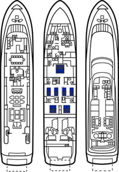 - Two VIP cabins with queen size beds on the lower deck.