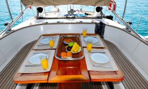 The yacht charter fee includes the charter of the yacht with all its tools, stores, cleaning material and basic consumable stores for engine room, deck and cabins, etc., the crew’s wages, food and the insurance of the yacht for marine risk and third party claims and the crew for employer’s liability insurance, water and ship’s laundry.