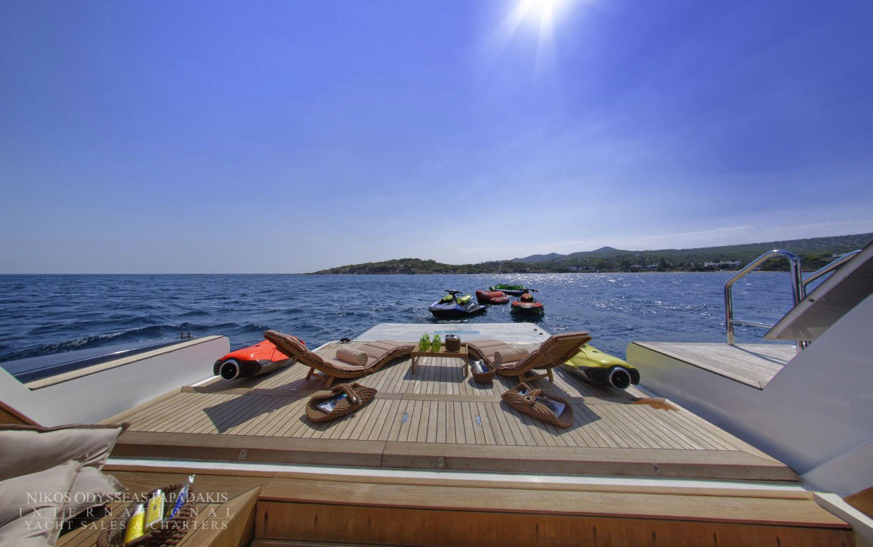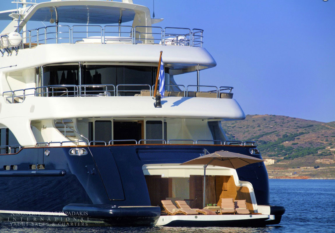 • Beach club / Garage: The massive garage accommodates the smaller tender boat and most of the water toys. When at anchor it transforms to a stunning BEACH CLUB with a large opening swimming platform sauna, a shower, a lounge, sound system & gym equipment.