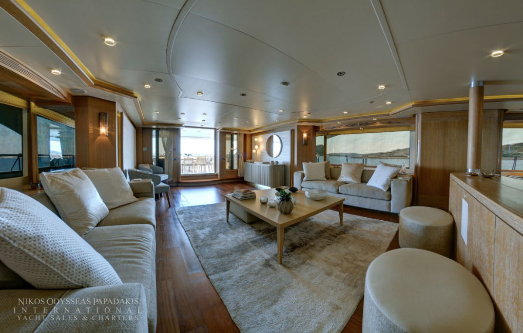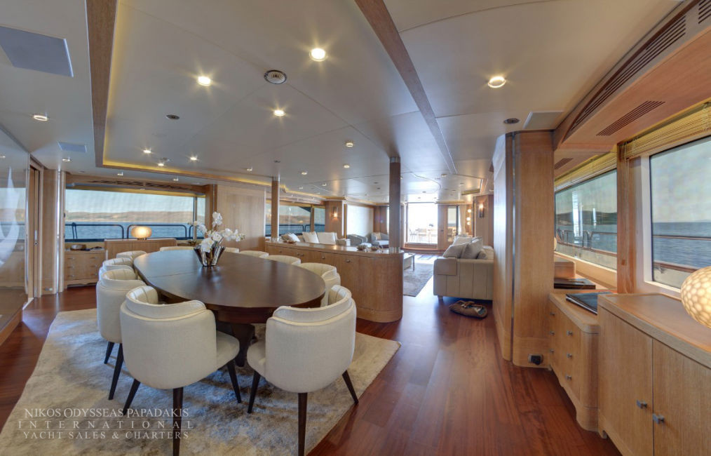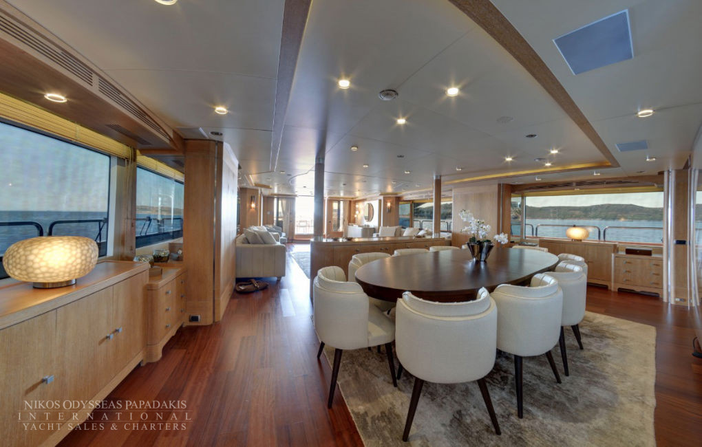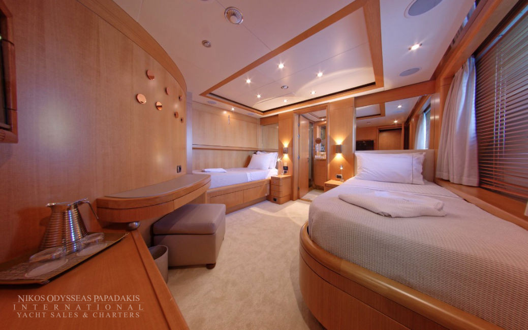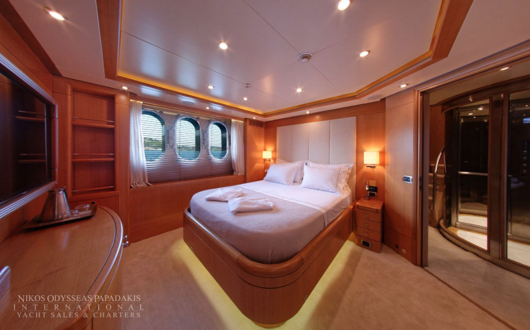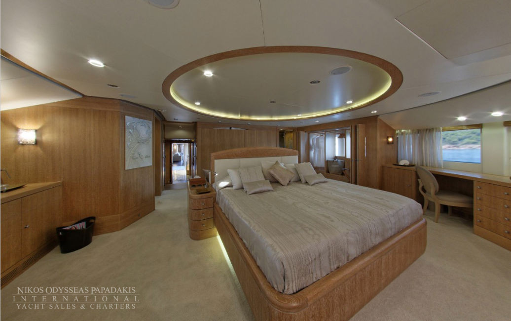 • 2 Large MASTER Cabins: Impressive MASTER suite on MAIN DECK with panoramic windows, private terrace with sitting & sunbathing areas, 2 bathrooms, Ultra-King bed & separate OFFICE which can also be used as a common area