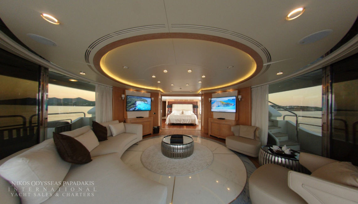 • Amazing 2nd MASTER suite on UPPER DECK, with an Ultra-King bed & a stunning CIRCULAR SKY LOUNGE offering 270° views through sliding glass doors, joining with the aft deck, creating a huge al fresco lounge. The SKY LOUNGE can be totally separated by the cabin to be used also as a common area.