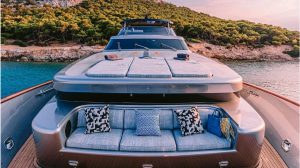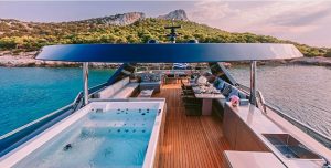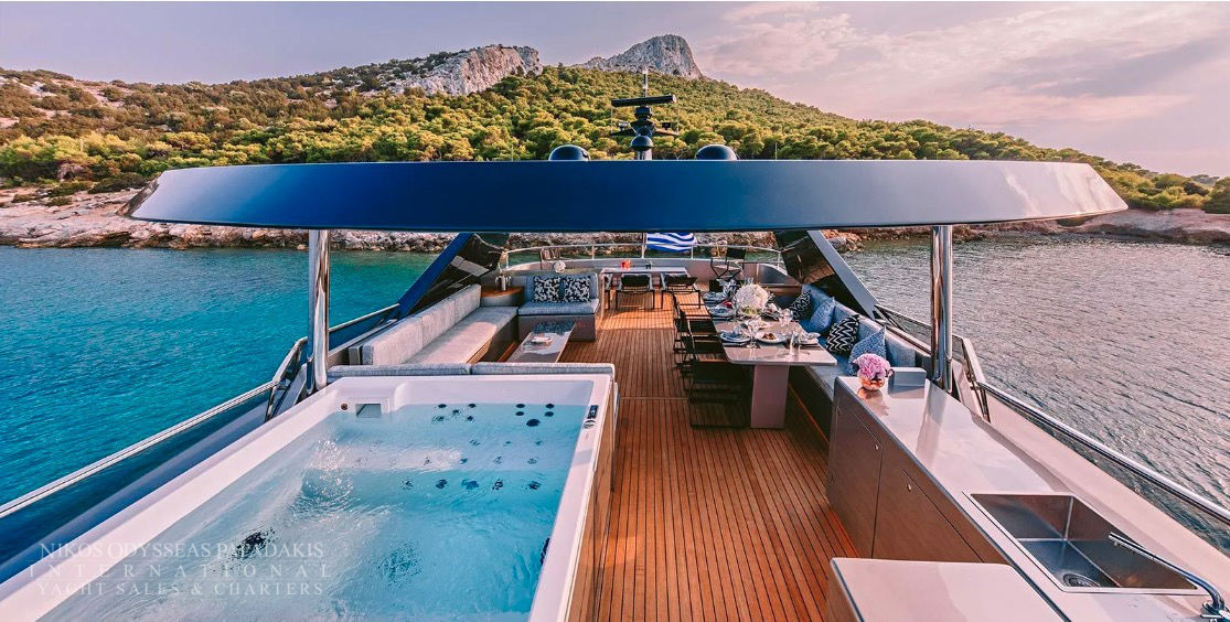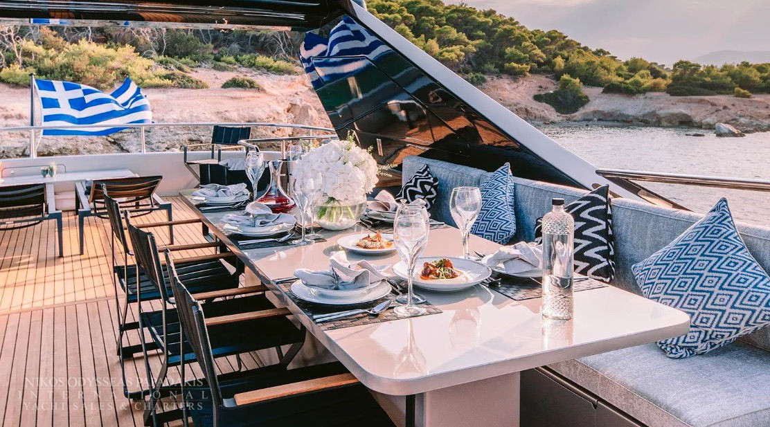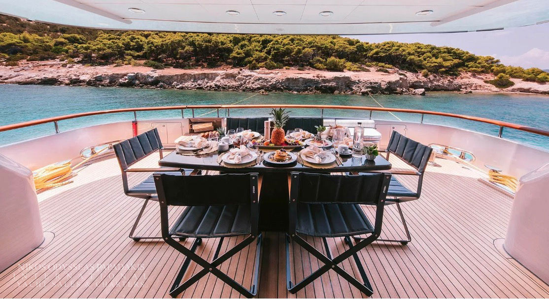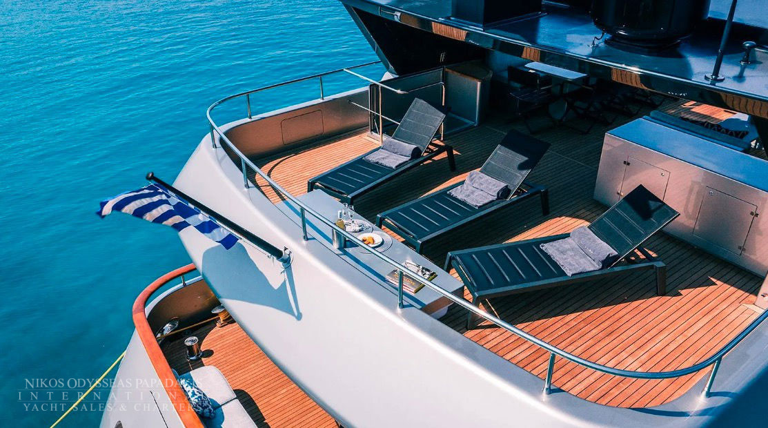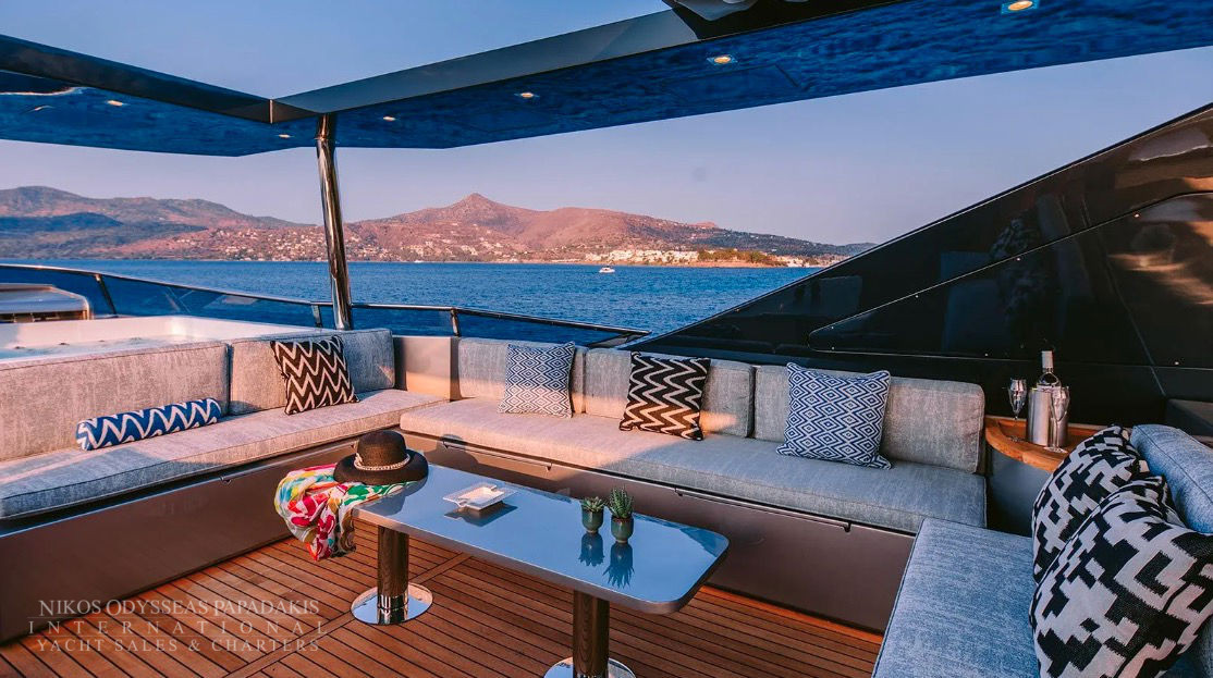 Her versatile sundeck has been designed as the social hub on board, with space for sunbeds, a full dining table and generous amounts of comfortable sofa seating