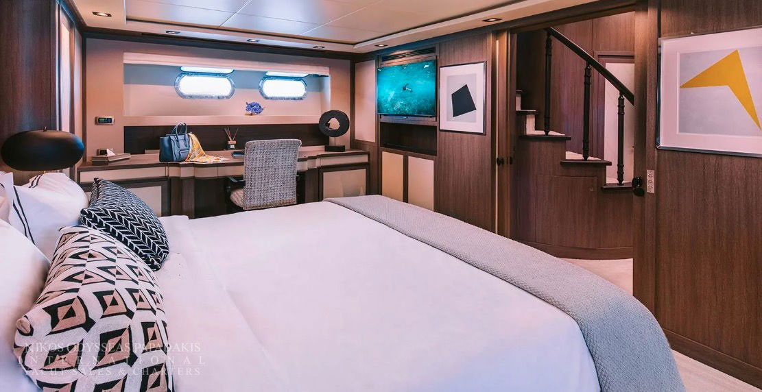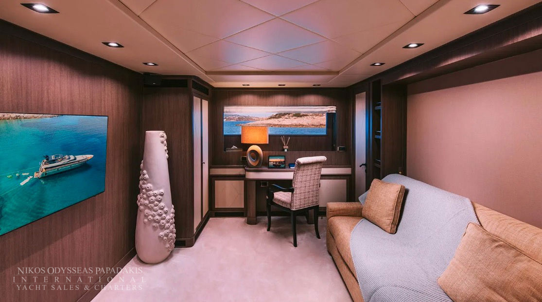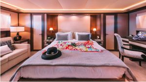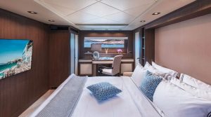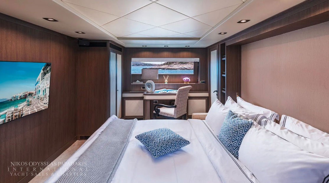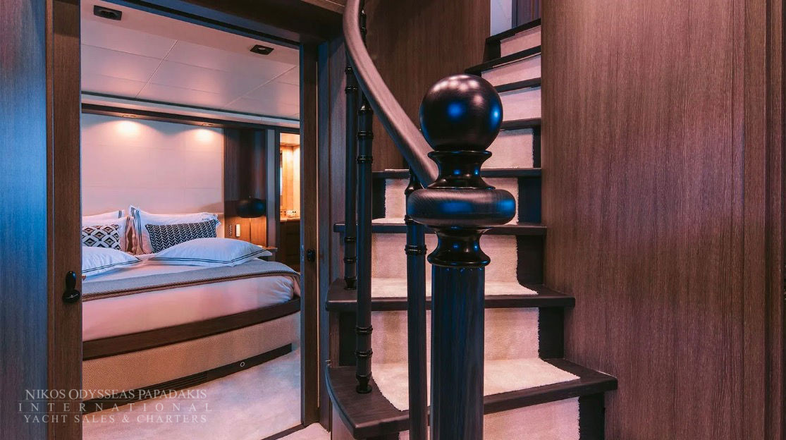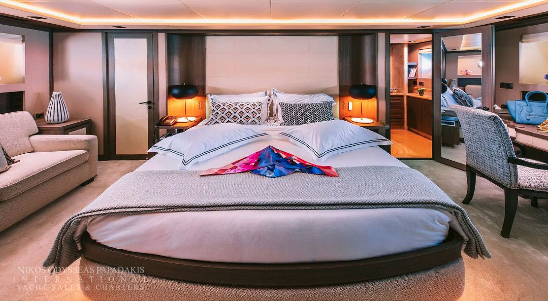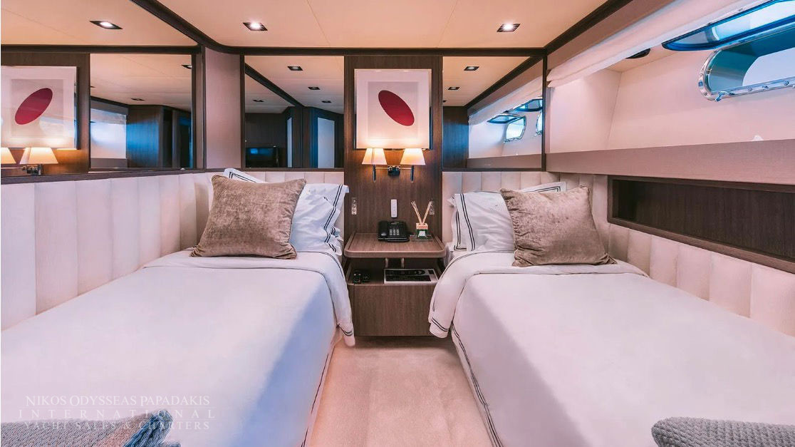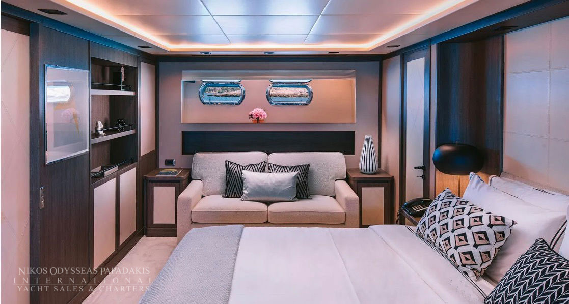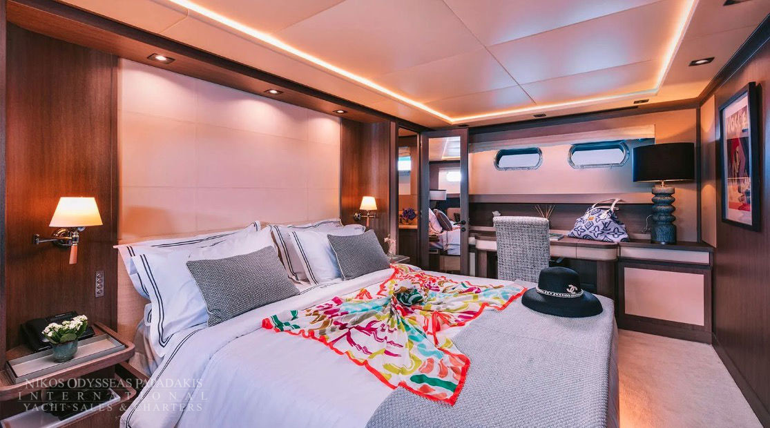 Cantieri Di Pisa Akhir 102 offers accommodation for twelve guests across five well-appointed cabins: on the lower deck a stunning full-beam master suite, a full-beam VIP cabin and two twin cabins that can be converted to double, and on the main deck a comfortable VIP cabin – each with an en-suite bathroom.