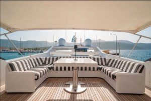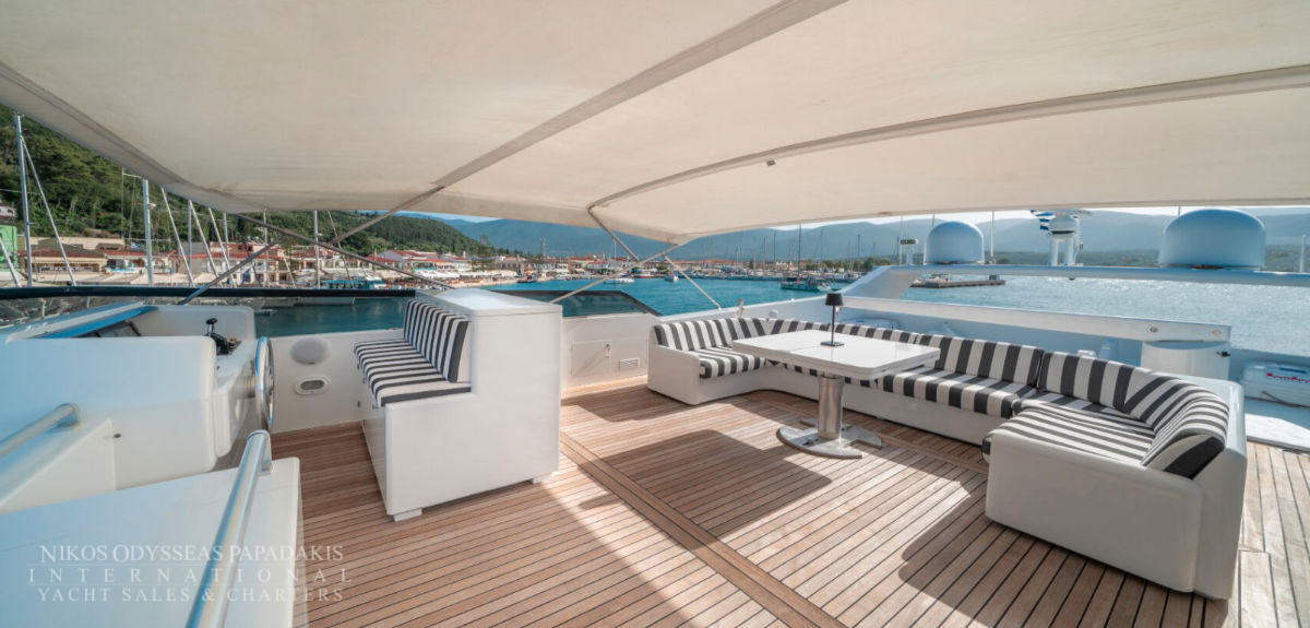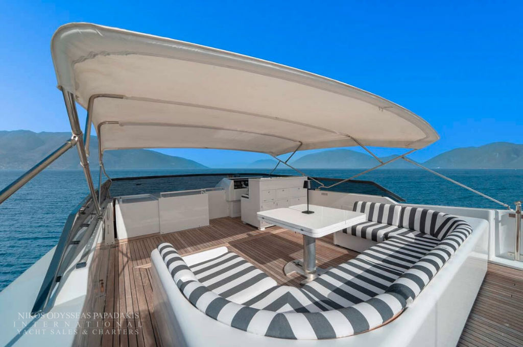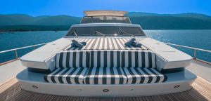 The foredeck offers elevated sun pads and a forward-facing sofa for sunbathing, while the aft deck provides a cushioned bench and flexible dining space.