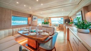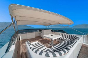 Spacious Outdoor Living: Features an open flybridge with a flexible table, U-shaped seating, a soft bimini for shade, and a sun deck perfect for relaxation in any weather.