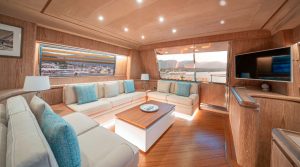 Elegant and Bright Interior : The interior is finished with blonde wood paneling, neutral-toned sofas, and panoramic windows that flood the space with natural light and scenic views.