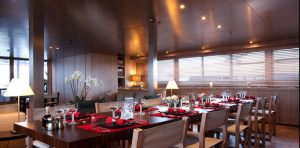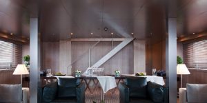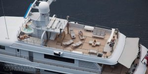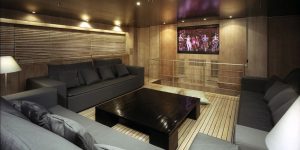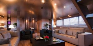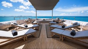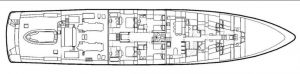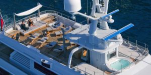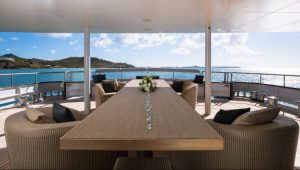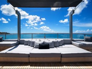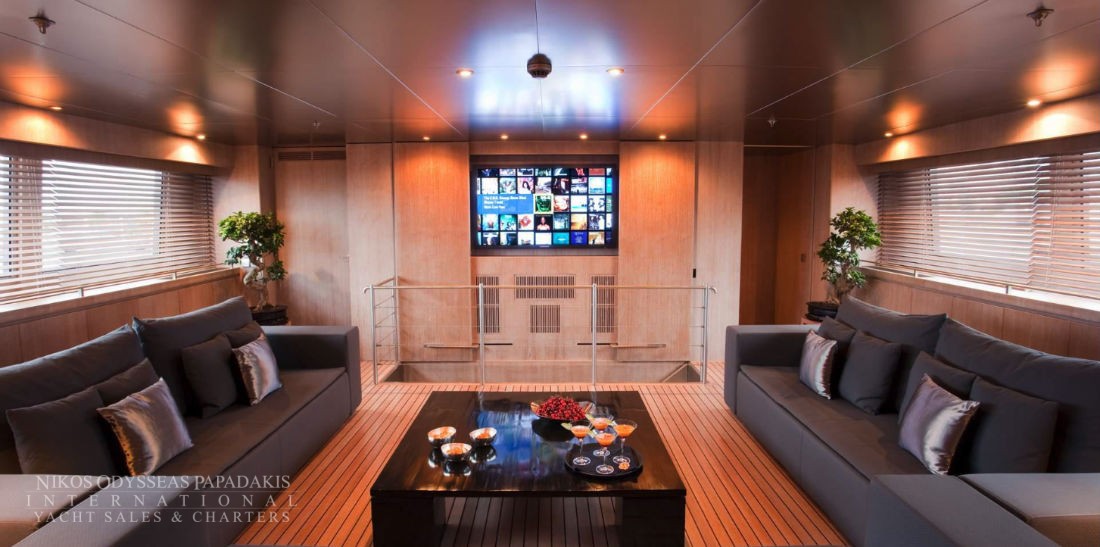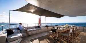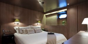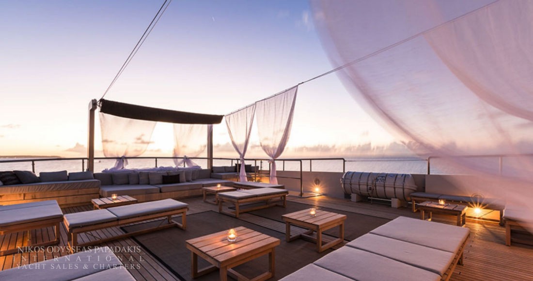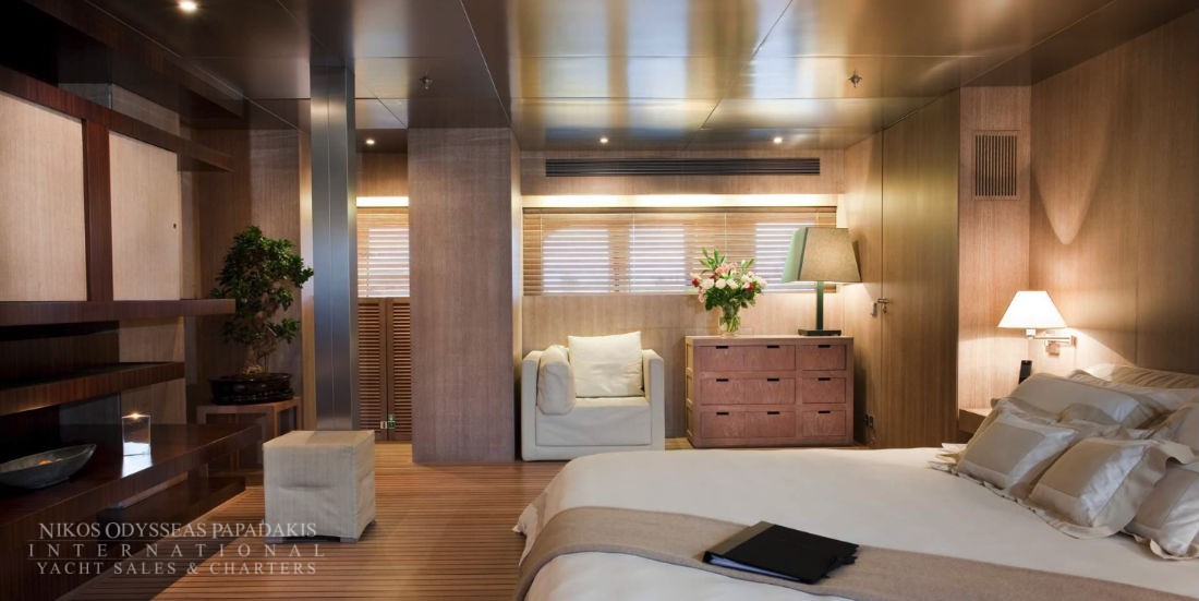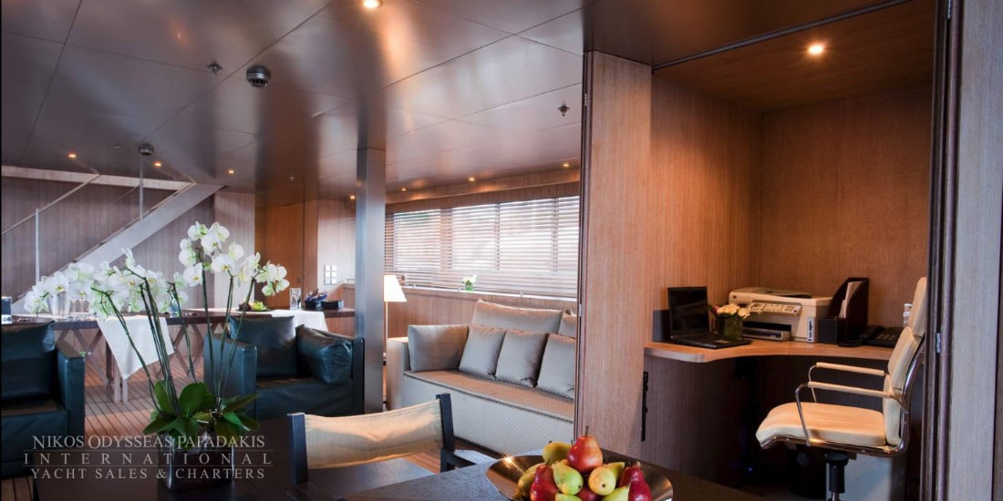 With open-plan saloons and minimalist staterooms, she has six well-appointed double cabins. The yacht is ideally set up for families and friends charters. An elevator connects all four decks, including a very large sun deck that can be flexibly shaded for sunbathing or an afternoon nap. The Jacuzzi that is found forward on the sun deck is the ideal place to enjoy sundowners.