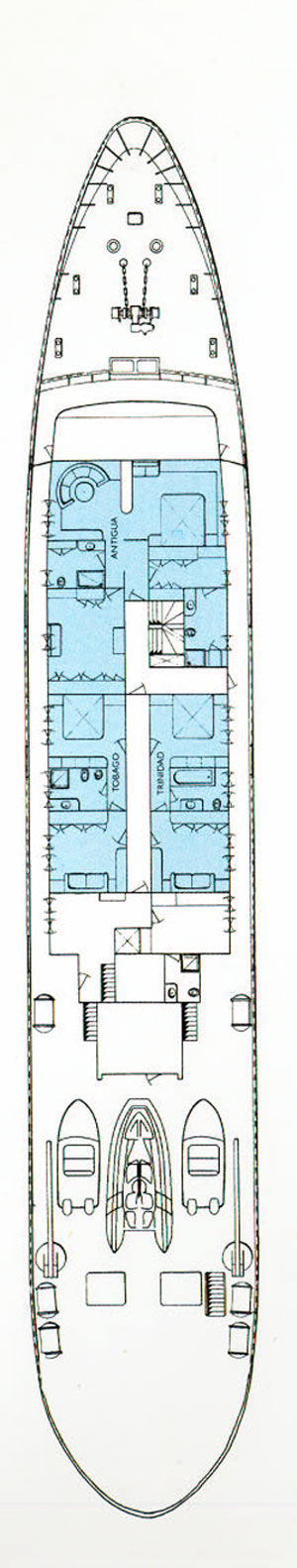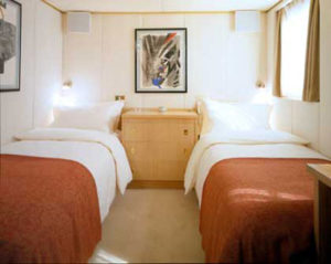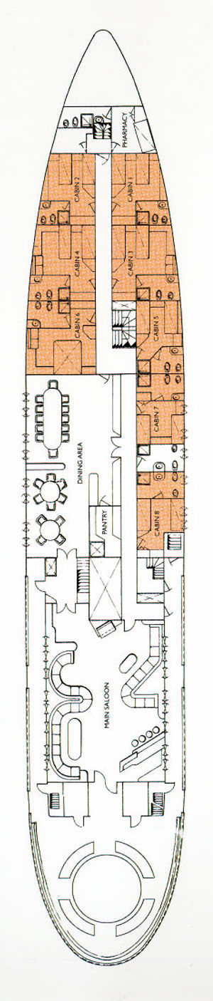 - Twin bedded staterooms, each with en suite shower room situated on the main deck