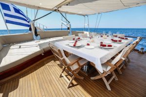 The charterer will be charged extra, at cost to the yacht, for all other expenses. These include fuel* for the yacht, fuel for the ski-boats or other tenders, food*, wine, beers, spirits and soft drinks for the Charterers (at retail super market prices), VAT (in Greece 11.5%) of the total yacht charter fee , other consumable stores, berthing dues and other harbor charges away from the yacht’s own berth, Corinth canal fees (if any), Private marine fees (if any), including pilotage fees and chargers for water and/or electricity taken from the shore, laundry, communications, hire costs of special equipment placed on board at the request of the Charterer, Gratuities for the crew.