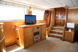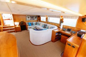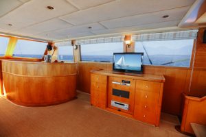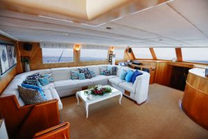- Lounge: As we enter in her bright and big lounge, we find on the left side a semi circular light beige couch, with a table that can be lifted or lowered at the height that you require. Further down on the right side, we have a large wooden bar, where you can have access to a very large galley with several fridges and freezers, fully equipped.
