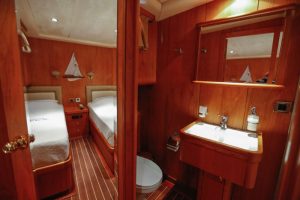 - The three doubles are located in the aft part and you can access them from the left side of the lounge by stairs.