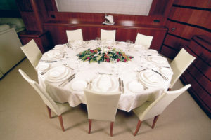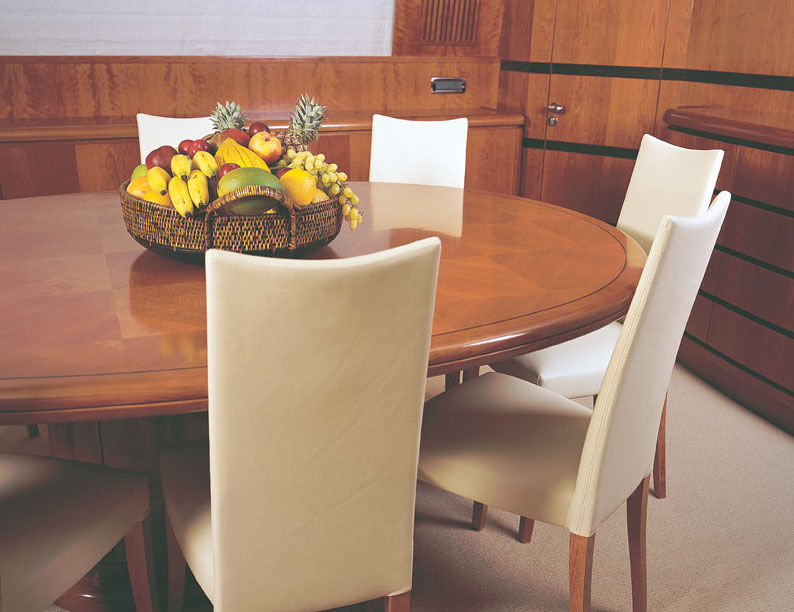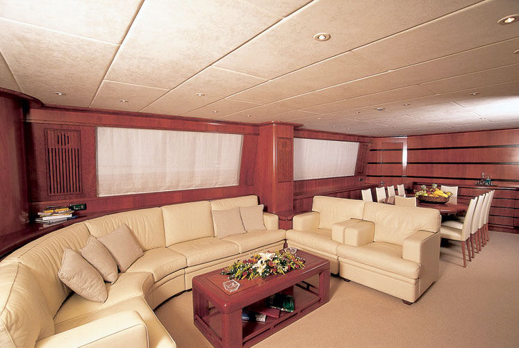 - There is no way one can be predisposed about the luxury encountered when entering the yacht’s interior. The handmade leather salon, the spacious dining area, which can comfortably accommodate 10 passengers, the cherry- tree wooden coating of the dining table, along with all the other precious furnishing materials, will make even the most demanding customers feel that they have found the Garden of Eden of a luxurious private yacht.