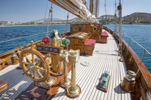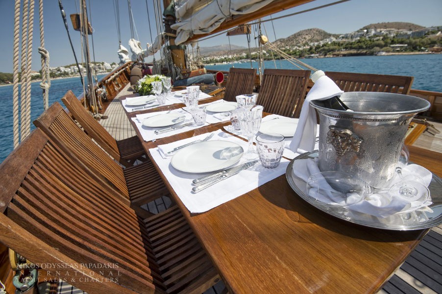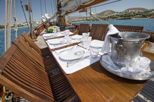 The charterer will be charged extra, at cost to the yacht, for all other expenses. These include fuel* for the yacht, fuel for the ski-boats or other tenders, food*, wine, beers, spirits and soft drinks for the Charterers (at retail super market prices), VAT (in Greece 11.5%) of the total yacht charter fee , other consumable stores, berthing dues and other harbor charges away from the yacht’s own berth, Corinth canal fees (if any), Private marine fees (if any), including pilotage fees and chargers for water and/or electricity taken from the shore, laundry, communications, hire costs of special equipment placed on board at the request of the Charterer, Gratuities for the crew.
