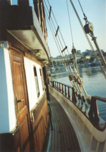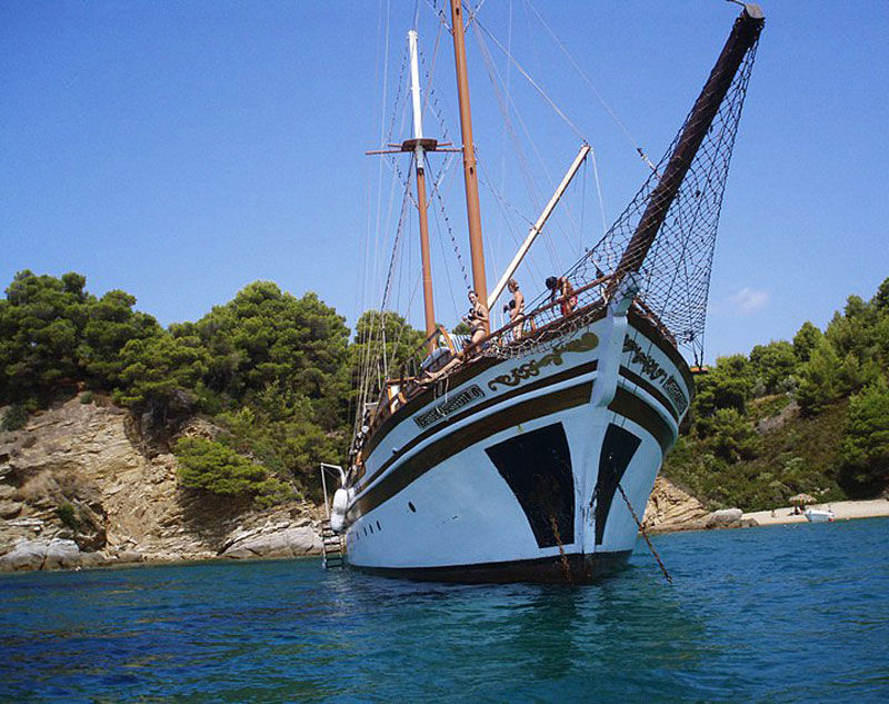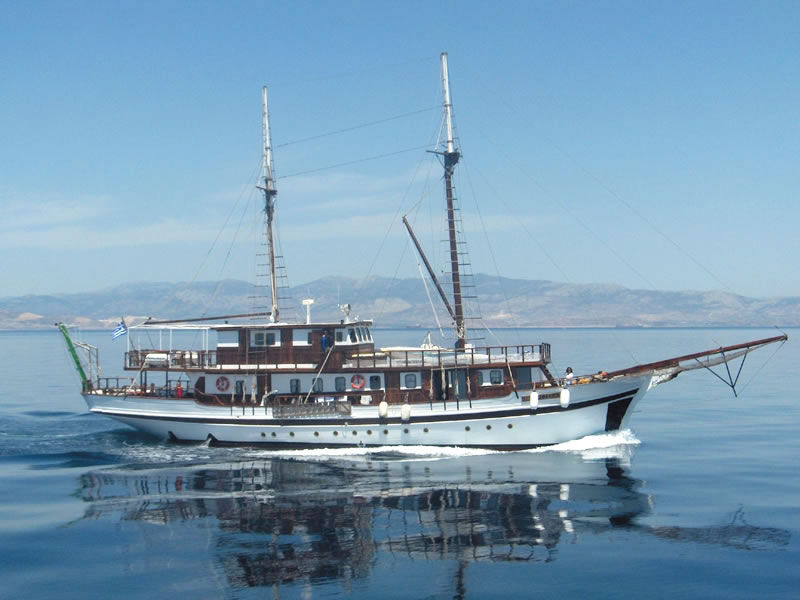 A 34 metres long traditional Greek motorsailer, fully air-conditioned with 10 double cabins, each with its own ensuite facilities and bath. She carries maximum 20 adults or 24 people if the group has kids.She has been totally refitted in 2001 and is available in the Ionian and Aegean waters .