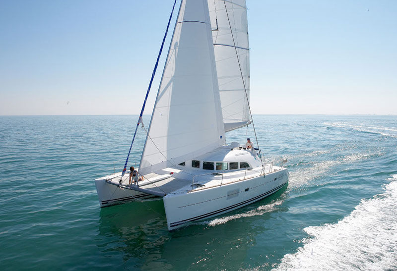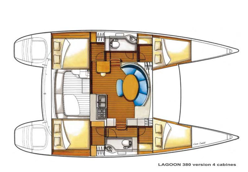 The Lagoon 380 is the product of many years’ experience and research and has been very well planned: access to engines from the transoms, large cockpit with table and bench seat, electric windlass, rigid walkway on the trampoline, wide sidedecks… And is distinctly the work of renowned architects, Van Peteghem and Lauriot-Prevost. With her simple deck layout, practicality, security and comfort on board (all control lines are brought back to the helm station) even a small crew will find it easy and fast to manoeuvre on the Lagoon 380. The galley is the strategic link between the saloon and the cockpit. The curved saloon offers a 360° view through the portholes and large bay windows. The chart table is directly accessible from the cockpit, a friendly area where the table is immediately adjacent to the galley and its bench seats. Space, volume, light, ergonomics, the warmth of wood, soft upholstery, all these characteristics have been taken into account to ensure you cruise in comfort.