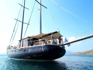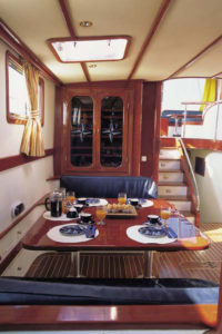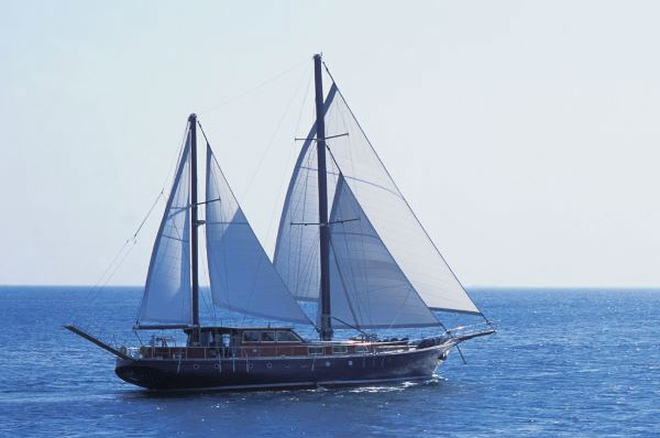 A high standard motor sailer, built in 1997 and renovated in 2009, she combines a magnificient Aegean pine wooden hull with modern sailing equipment and 400m2 sail area. Her luxurious large master suite and four double luxurious cabins with ensuite showers can comfortably accommodate ten guests, while its professionally skilled crew of four (Captain, Chef, Deckhand and Steward), accommodated in totally separate quarters with own facilities, guarantees exceptional service and an unforgettable travel experience. The unusually wide saloon with rosewood and blue leather interior offers a lounging area with large windows, which ensure a bright daytime environment. A fully equipped bar and a dinning area in the lower deck offer further space for refreshing cocktails and more formal dining. The aft deck is ideal for all al fresco luncheons shaded by full awing, or a romantic dinner under the stars.