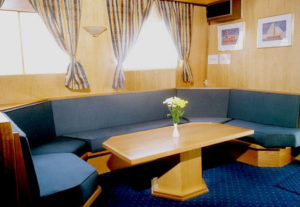 There are double, two lower single or upper/lower berth cabins available, all are compact but comfortable with windows or portholes, small private shower with WC and small wardrobes.  The vessel’s power is 220v with European sockets.
