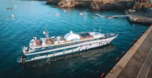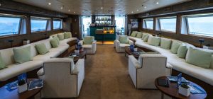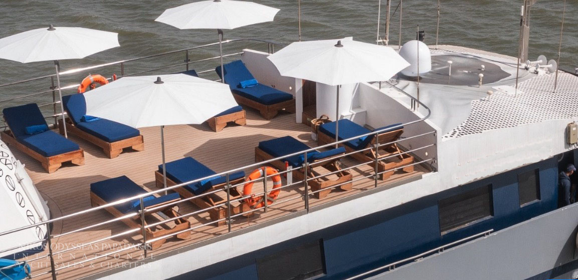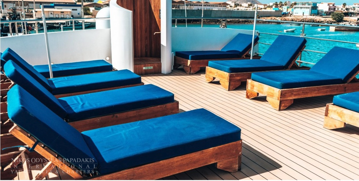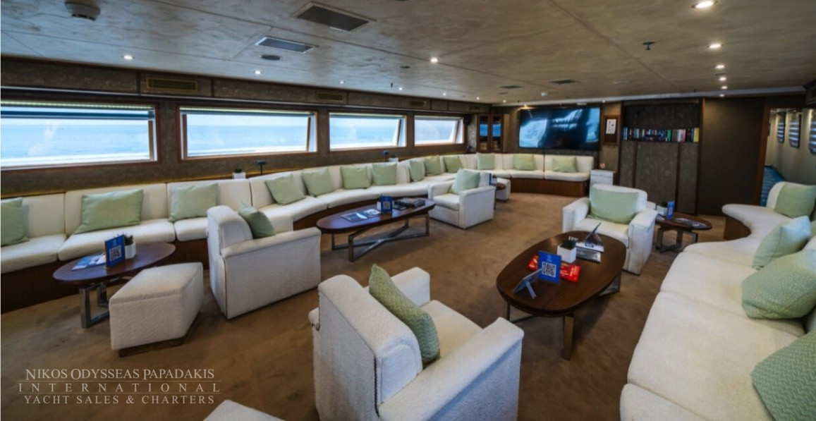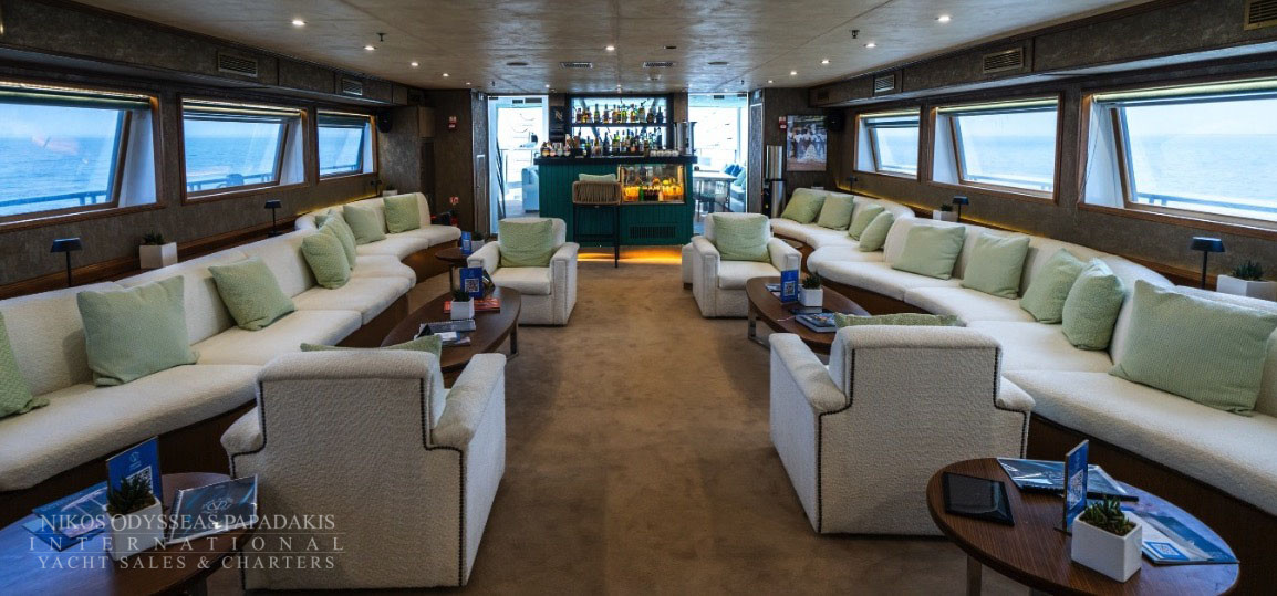 Discover the world by sea at 10 knots per hour, in her un-rushed pace, one island or seashore at a time. The Mini Cruise Ship 177ft. seduces her select 44 guests with her sleek lines and ample deck space redefining what yachting was meant to be. A spacious lounge with ample space, dining areas decorated with warm colors, large windows offering pristine views of all destinations, shaded areas and outdoor bar and loungers are just some of the