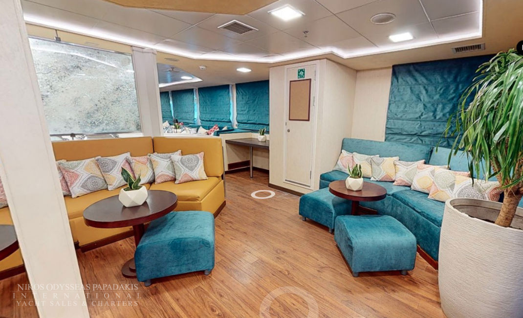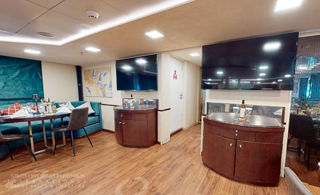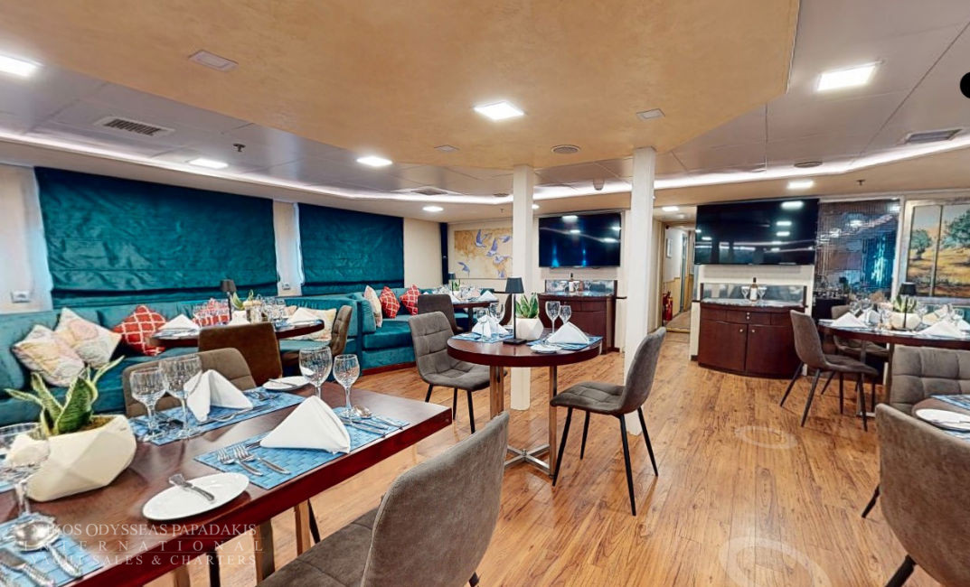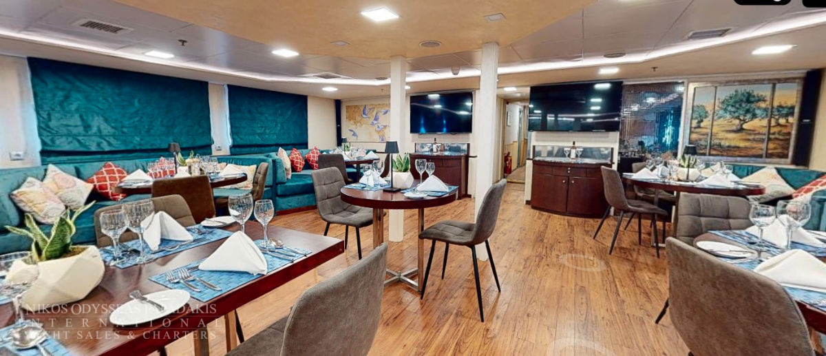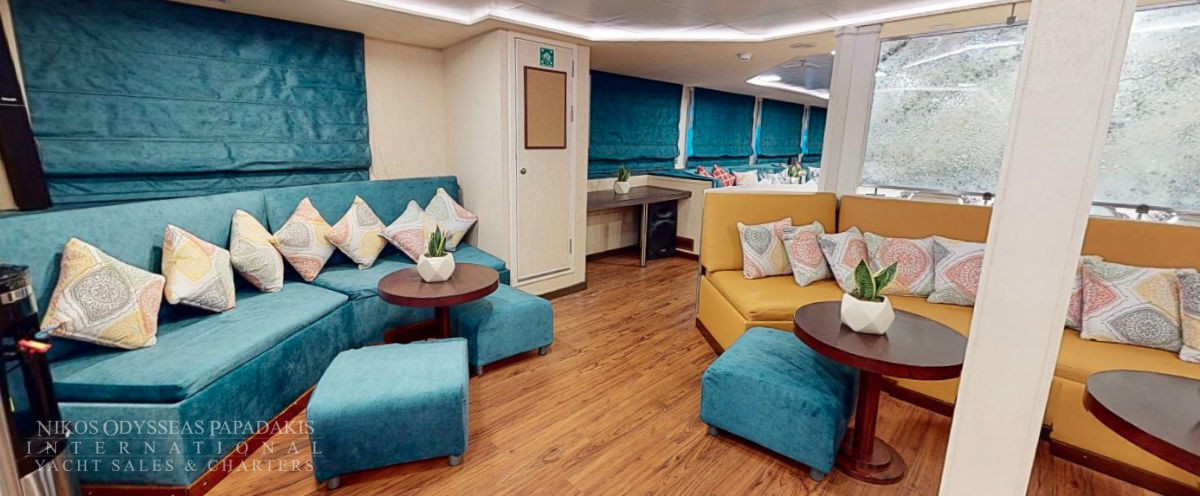 Mini Cruise Ship 55m. features a spacious lounge with classy seating and an American Bar leads into a dining area decorated with warm colors. Both areas offer large windows providing for the most beautiful views of all destinations the ship cruises to.
