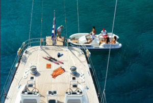 The charterer will be charged extra, at cost to the yacht, for all other expenses. These include fuel* for the yacht, fuel for the ski-boats or other tenders, food*, wine, beers, spirits and soft drinks for the Charterers (at retail super market prices), VAT (in Greece 11.5%) of the total yacht charter fee , other consumable stores, berthing dues and other harbor charges away from the yacht’s own berth, Corinth canal fees (if any), Private marine fees (if any), including pilotage fees and chargers for water and/or electricity taken from the shore, laundry, communications, hire costs of special equipment placed on board at the request of the Charterer, Gratuities for the crew.