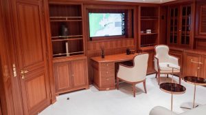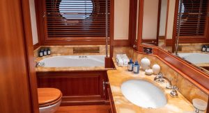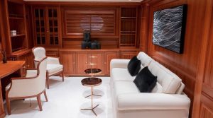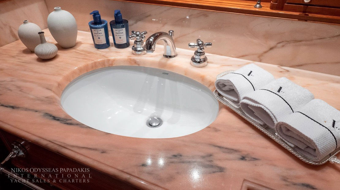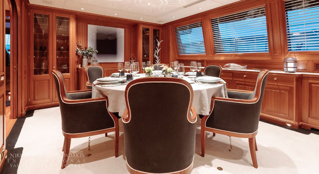 The versatile layout accommodates 12 guests in five cabins all with en suite bathrooms, including the master suite. Alternatively, the flexible arrangement offers the option of converting the fifth stateroom into a master suite lounge or office. Throughout the cabins, bamboo towels and Aqua di Parma toiletries add the finishing touch, complemented by the yacht’s plastic-free policy.