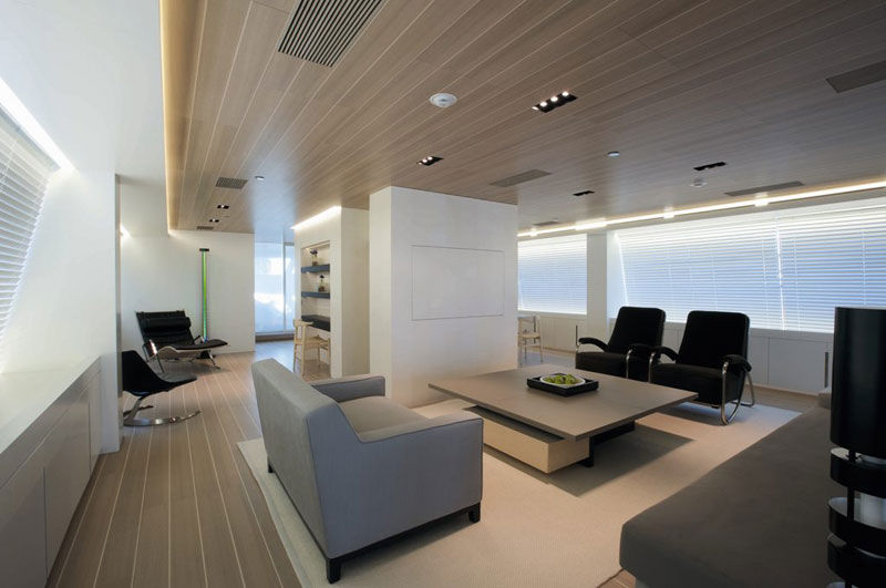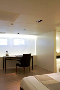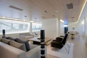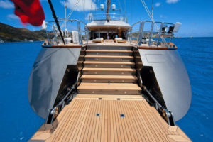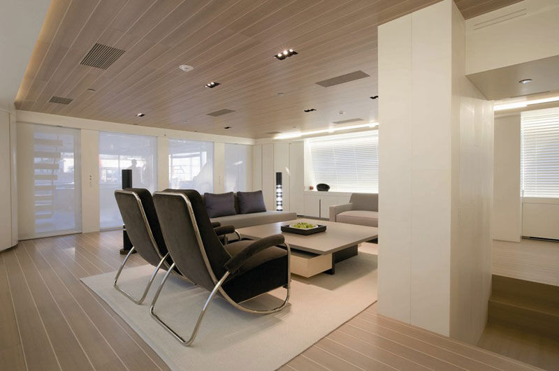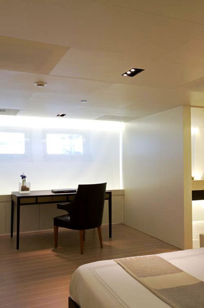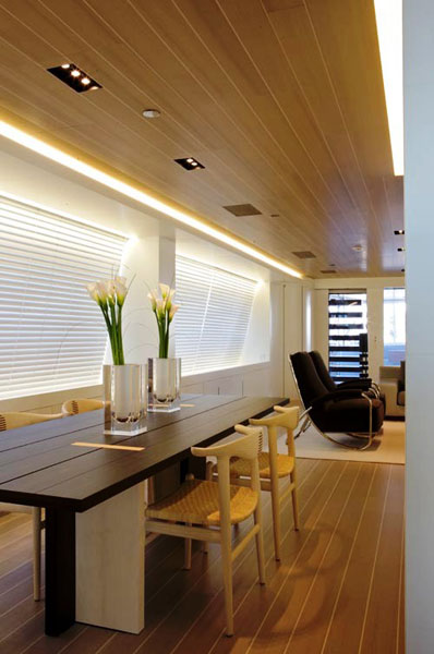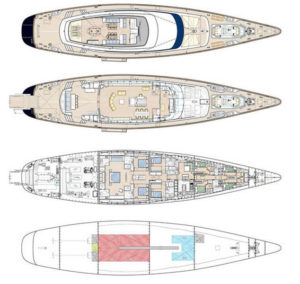 - The main deck is conceived as open living space, with no partitions, with the aim to keep a much clearer, unencumbered visual field than is conventionally the case on sailing yachts of this type.