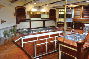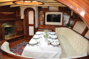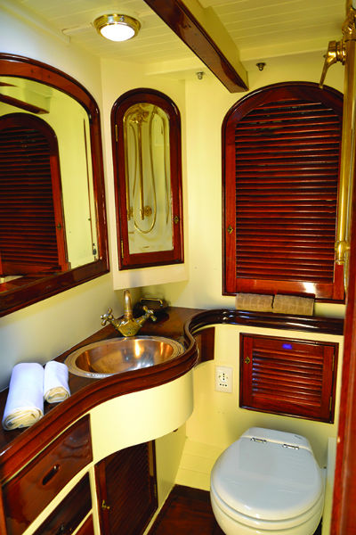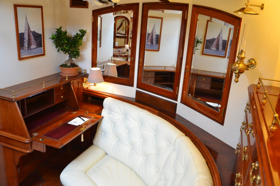 The owner’s suite at the stern includes a comfortable sofa with a desk on starboard and a nice vanity corner with sink on port.