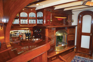 On the fore starboard side of the suite there’s a comfortable bathroom with a wooden masterpiece bath tub.