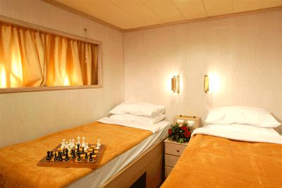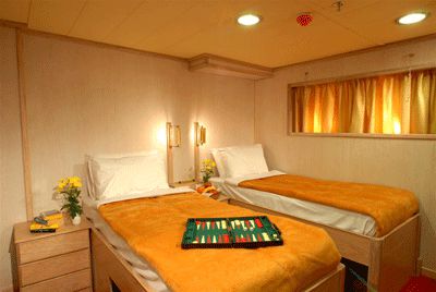 - Cabins on Lower deck (portholes): 1 Double or 2 Lower Beds.The cabins are air-conditioned and fitted with central music, internal telephone, safe deposit boxes, hair dryer & en suite bathroom with shower.