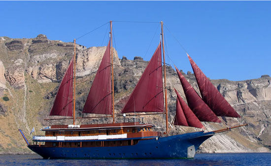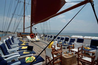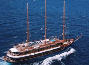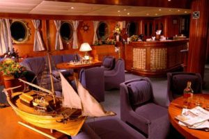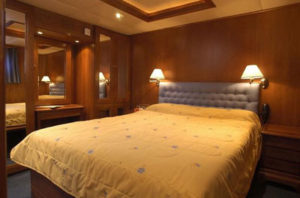 The 51 meter Motor Sailer is a classic steel hull motor sailer, with spacious and well appointed interiors renovated in 2007. At the main deck, a lounge area with an American bar leads into a warm and elegant dining room finished with wood and leather. Guests can enjoy the most a shaded outdoor deck area with an outdoor bar and the ship’s sun deck equipped with sun beds, deckchairs and a Jacuzzi. Guest cabins all with large windows or portholes. Elegantly decorated, they have either twin or queen sized beds and bathrooms with showers en suite. All cabins are fully air- conditioned and offer storage space, radio music controls and telephones.