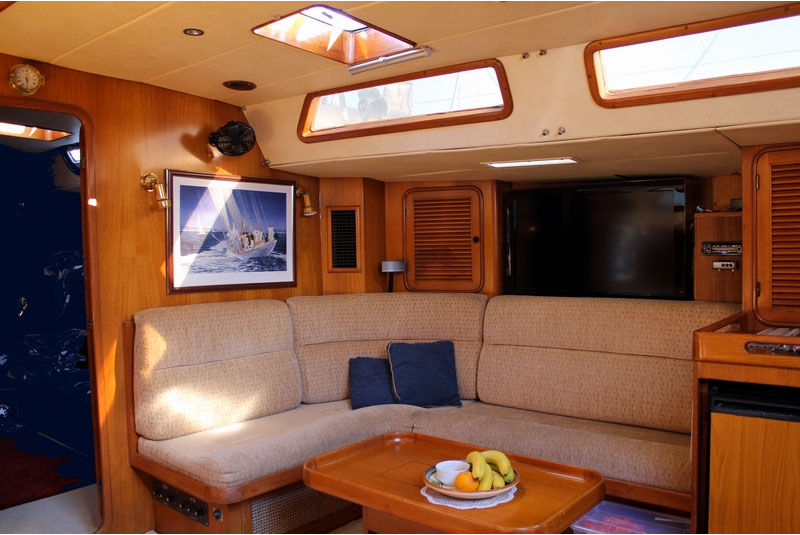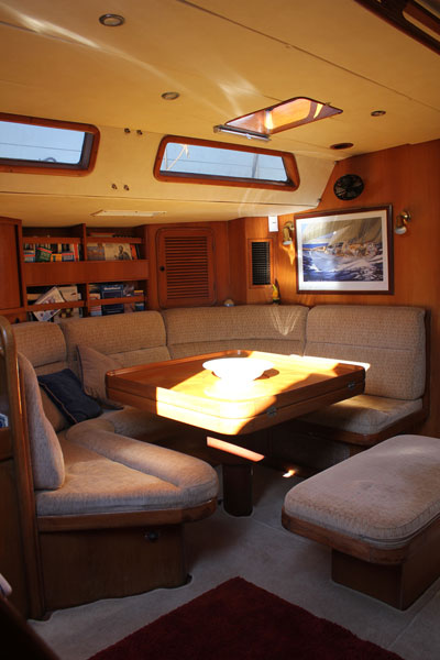 - A sumptuous salon is amid ship with U-shaped sofa area to port with drop leaf table seating up to eight. Adjacent to starboard is a comfortable L-shaped sofa arrangement and drop-leaf coffee table. The fully equipped Galley is discretely off to the port side aft.