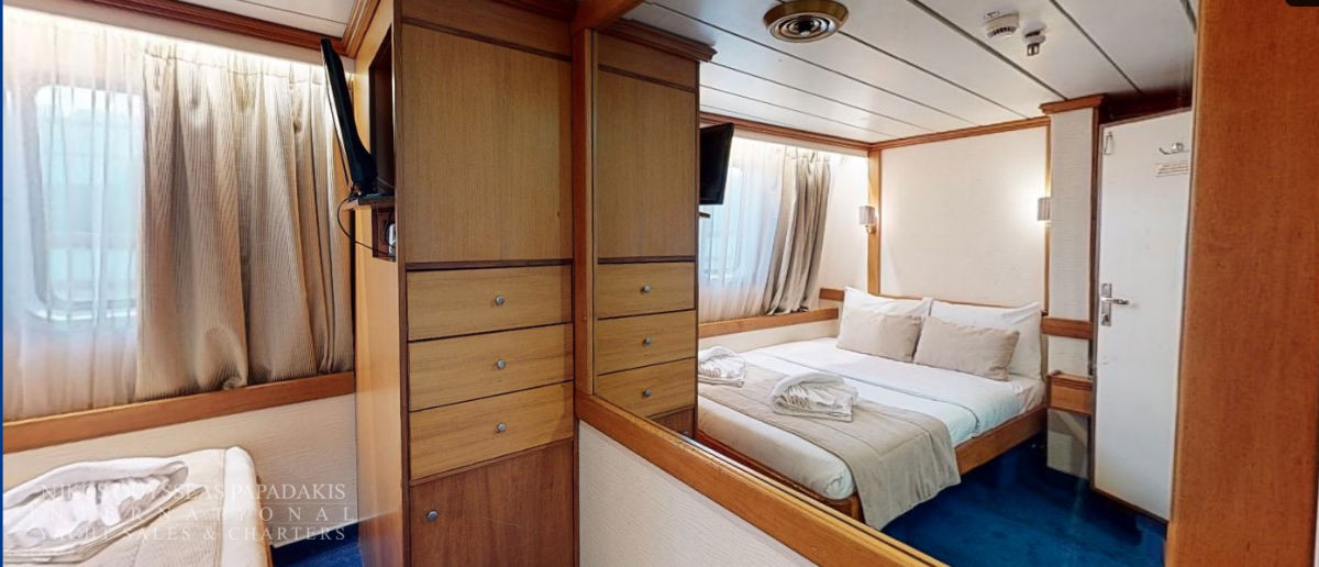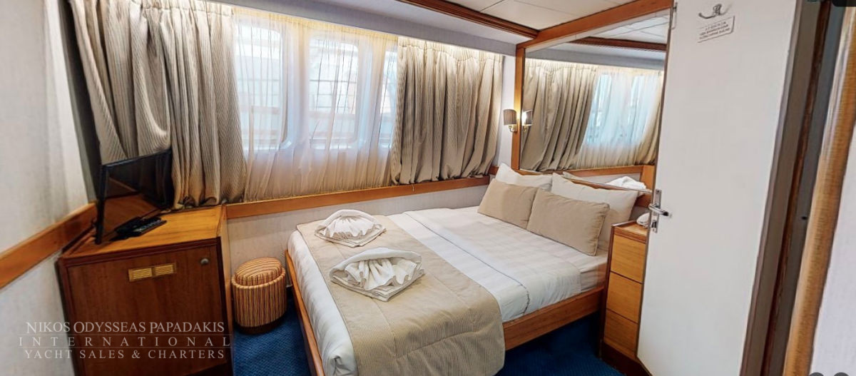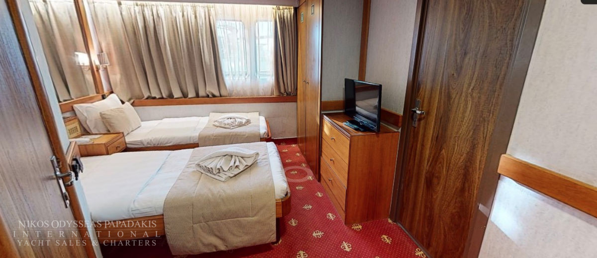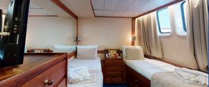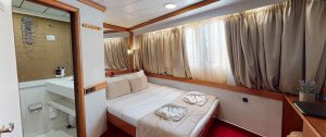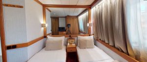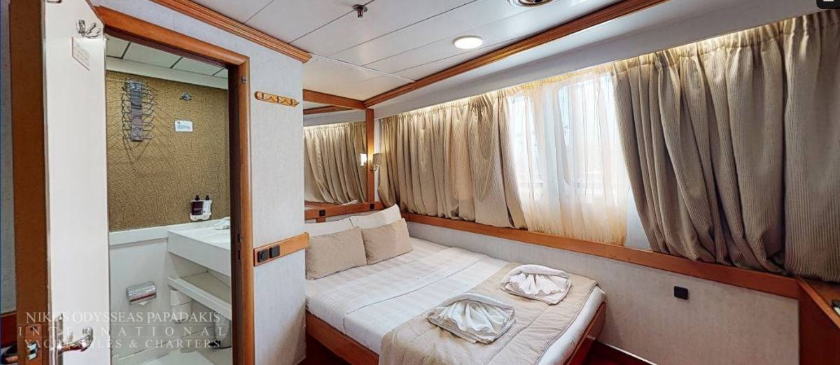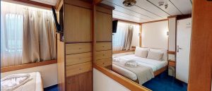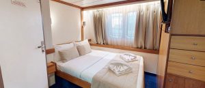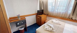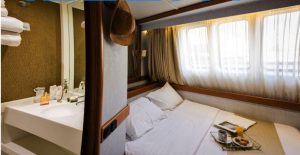 - Main deck and Upper deck (Windows) : Cabins have large windows enabling a breathtaking view or the areas you are cruising in. The cabins are air-conditioned and fitted with TV, telephone, hairdryers, mini-fridge, central music, and public address system and safe boxes. The fully equiped bathrooms are finished with marble.