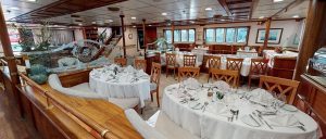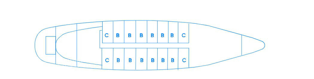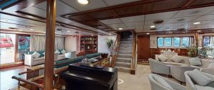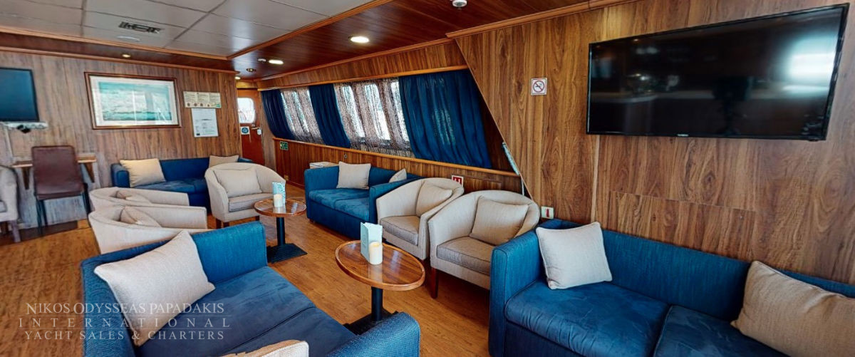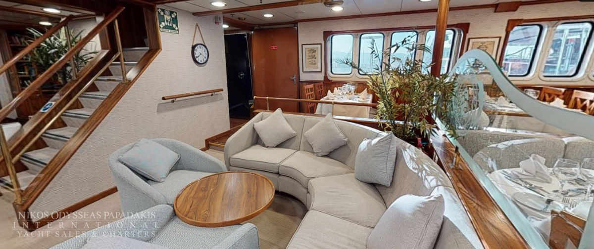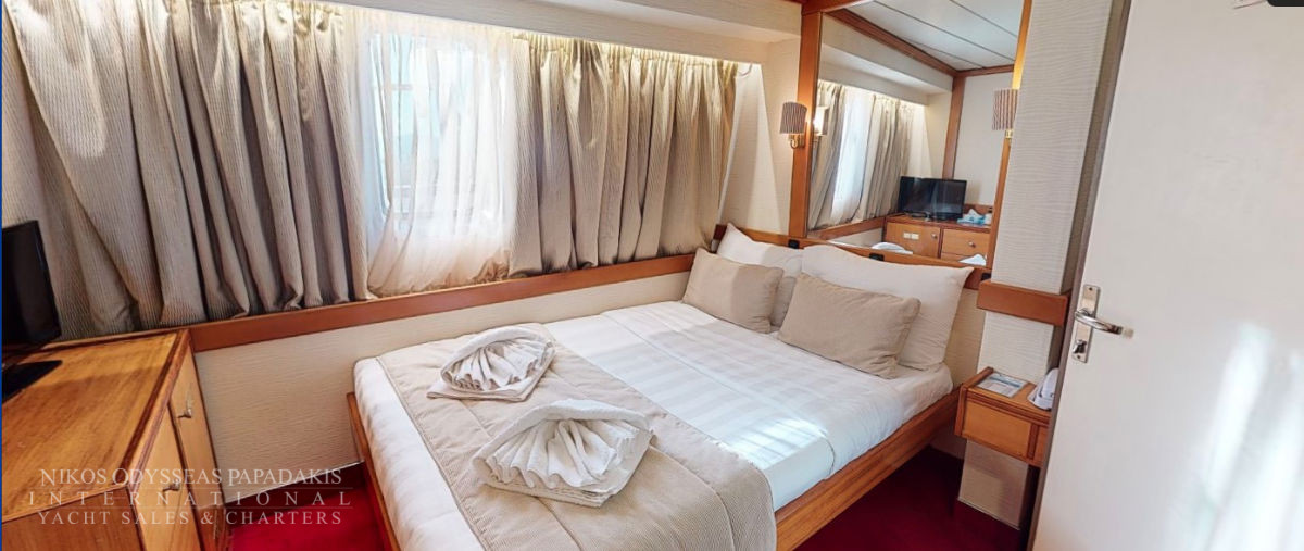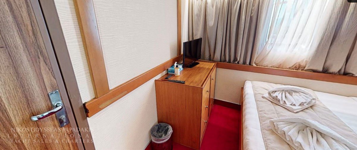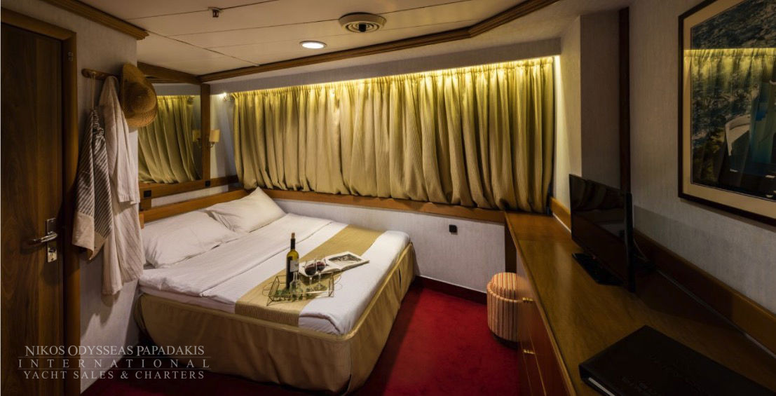 - Main deck and Upper deck (Windows) : Cabins have large windows enabling a breathtaking view or the areas you are cruising in. The cabins are air-conditioned and fitted with TV, telephone, hairdryers, mini-fridge, central music, and public address system and safe boxes. The fully equiped bathrooms are finished with marble.