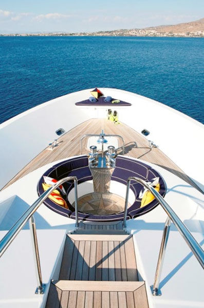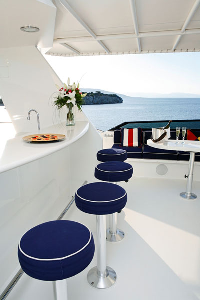 Her fly bridge provides large sun pads, seating for up to 14 people, a hard top and 2 large umbrellas for shade, a wet bar with sink, refrigerator and a large barbeque, 4 bar stools and a pilot station. There is also a fore deck circular seating area, located on the bow, for sun-bathing or just enjoying fresh air.