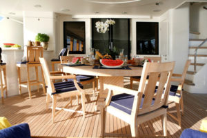 The remaining five staterooms are found below decks. On the large covered aft deck, guests can enjoy dinning and their favourite drinks from the bar.