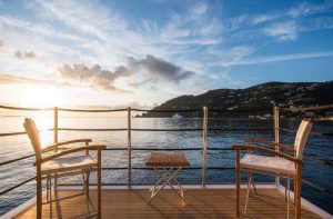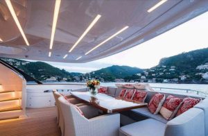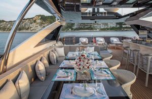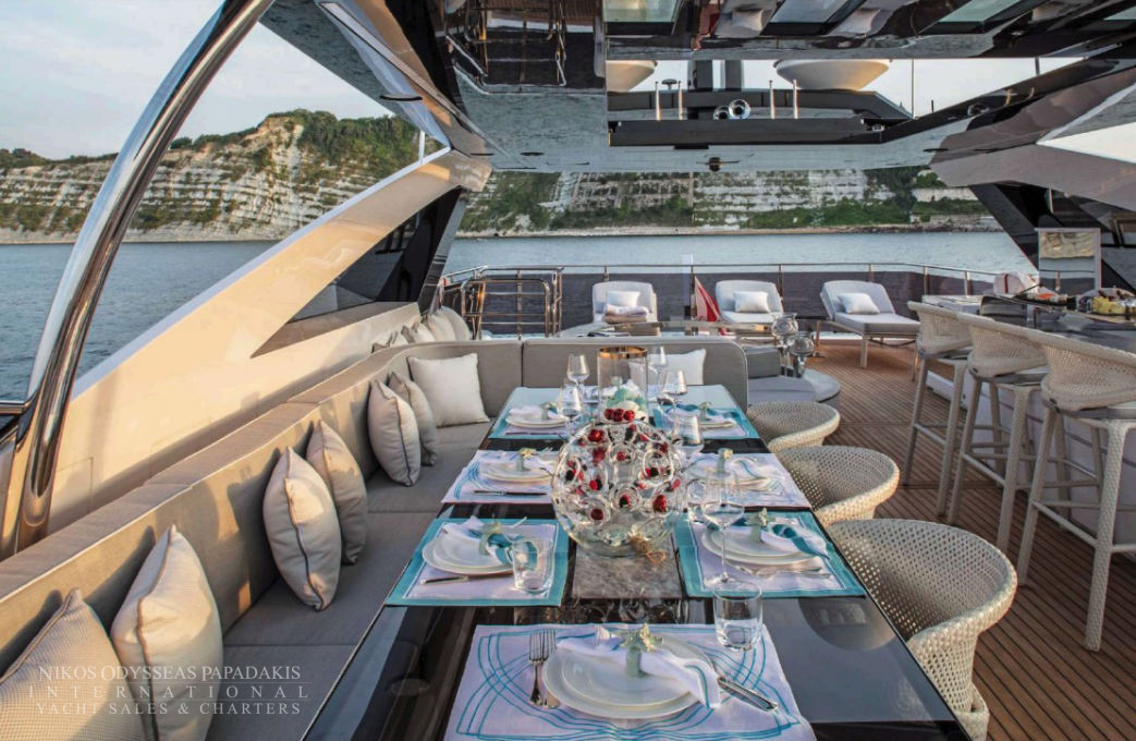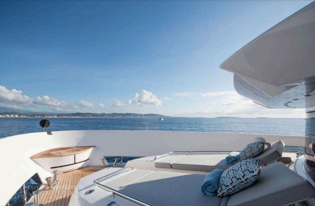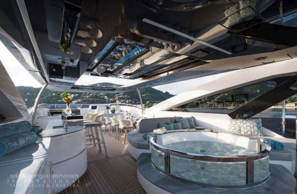 - The upper deck is a superb sundeck, with full dining table, bar, jacuzzi, sunbathing area, flybridge and bridge access.