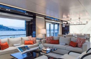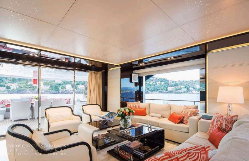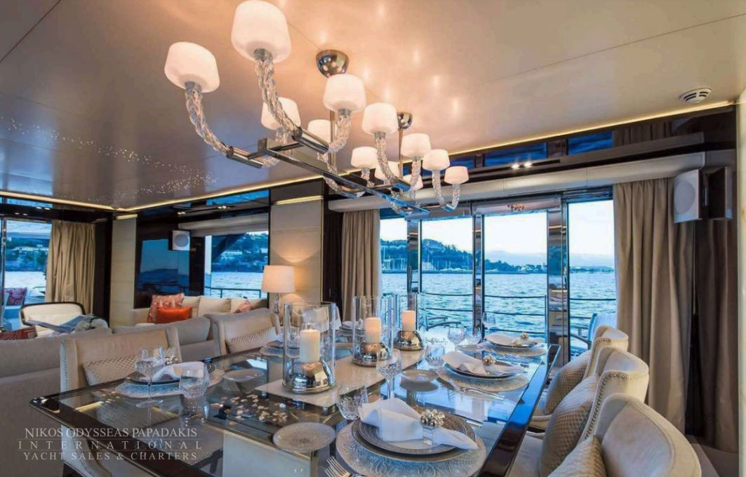 - From the main deck aft exterior dining room, you arrive directly into the main salon, open to the interior dining and then forward to the galley, lobby, day head and then forward to the Master suite.