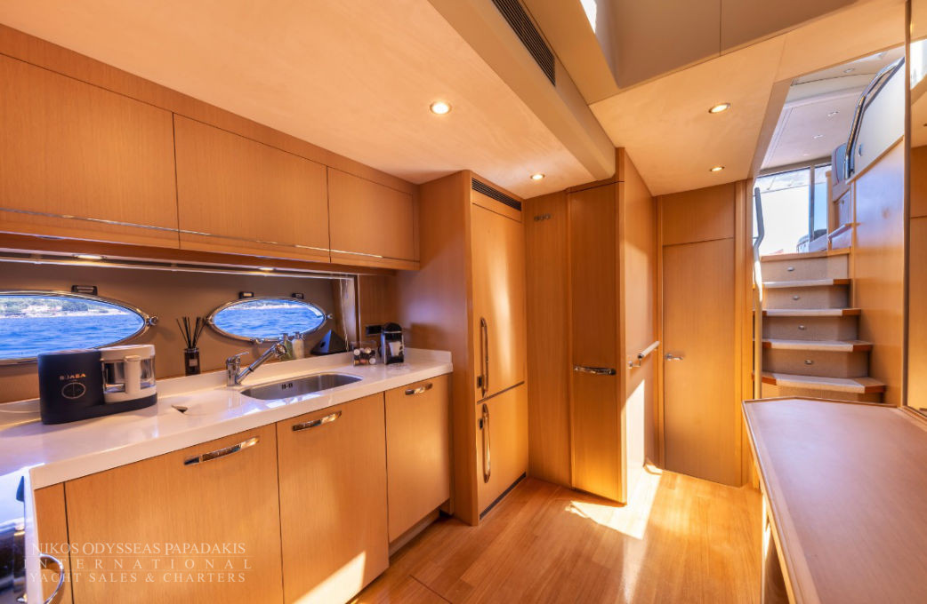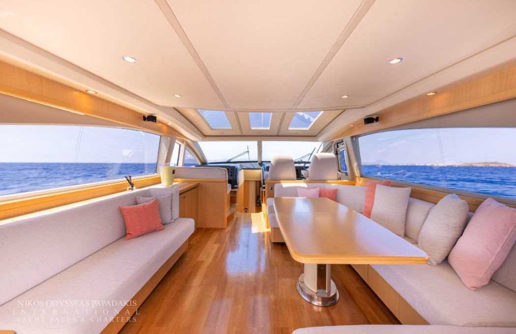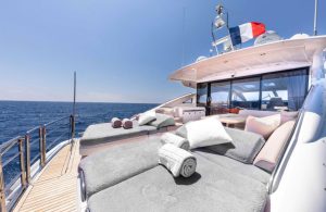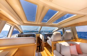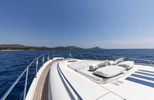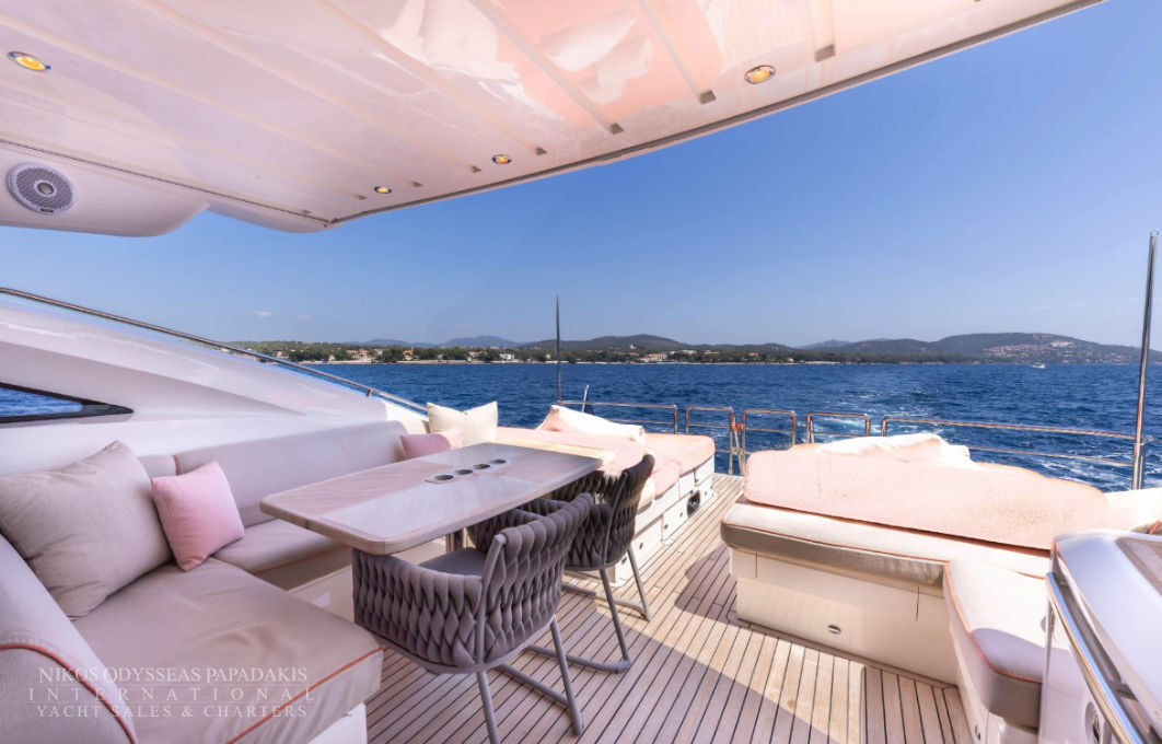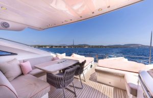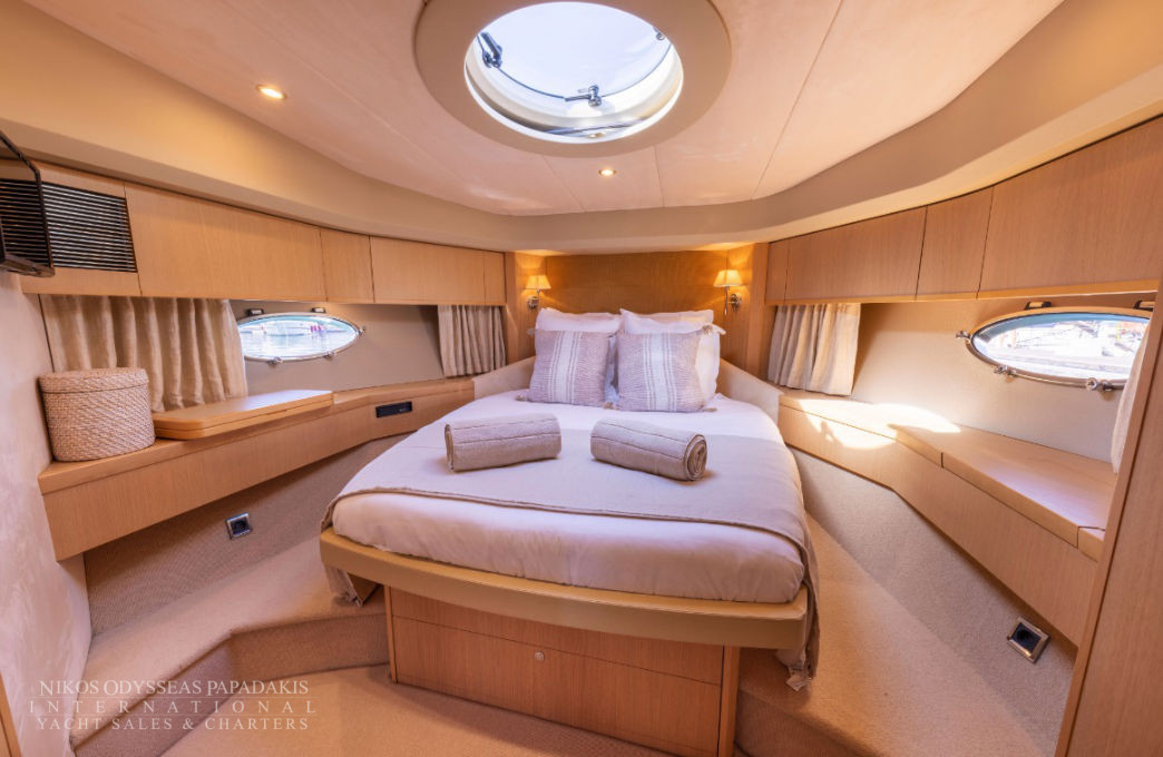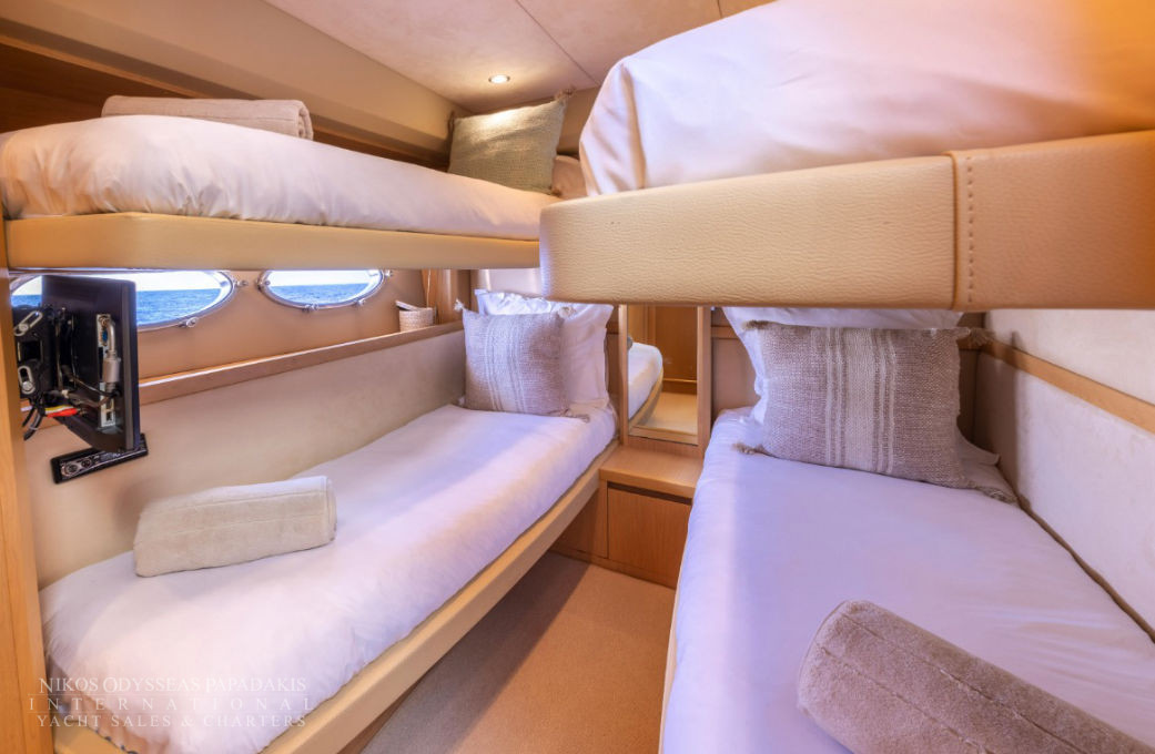 Her 21.69-meter length encompasses three beautifully appointed cabins — a full-beam master suite, a double cabin, and a twin cabin with 4 beds — providing comfortable accommodation for guests. The yacht’s elegant profile and smart exterior layout underscore Princess’s craftsmanship and timeless design.
