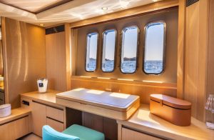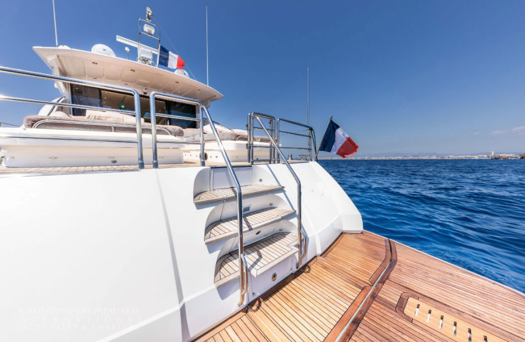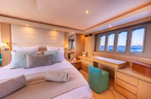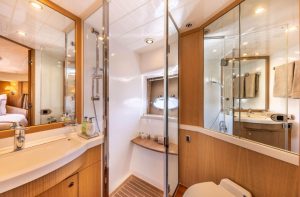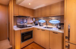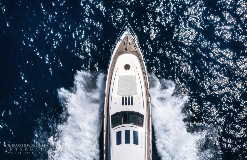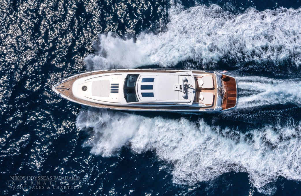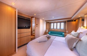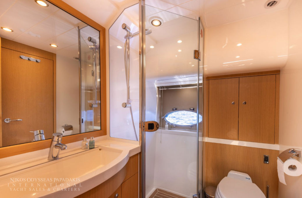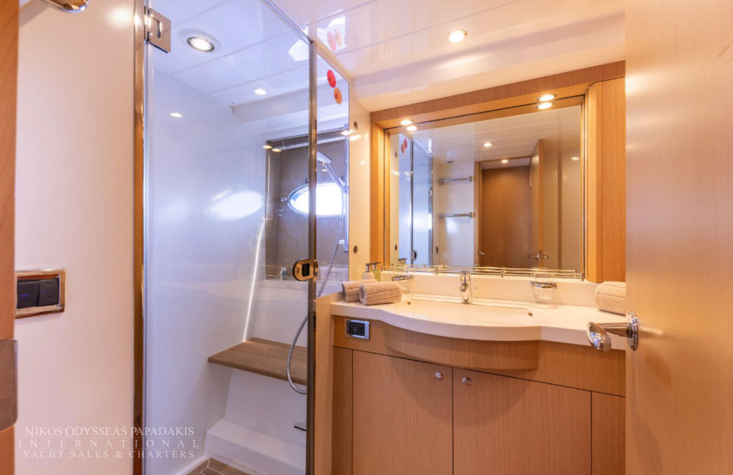 Her 21.69-meter length encompasses three beautifully appointed cabins — a full-beam master suite, a double cabin, and a twin cabin with 4 beds — providing comfortable accommodation for guests. The yacht’s elegant profile and smart exterior layout underscore Princess’s craftsmanship and timeless design.