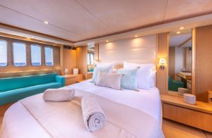 The deck spaces invite relaxation and socializing, with generous sunbathing areas and a well-planned open-air dining space. Inside, the salon blends comfort and functionality, ensuring every moment on board is both enjoyable and effortless.