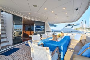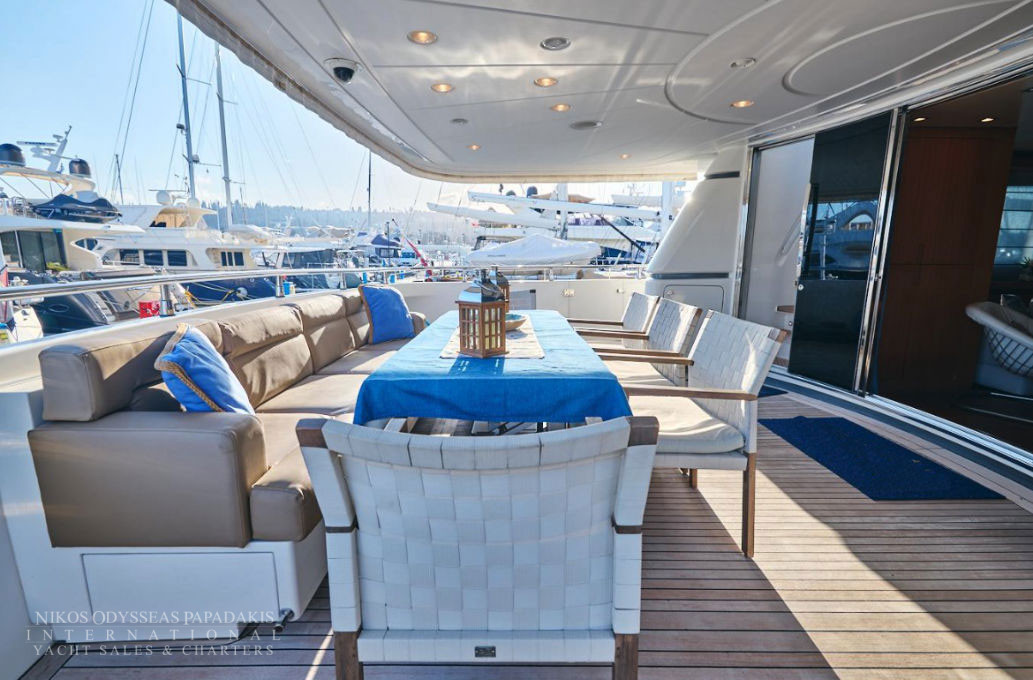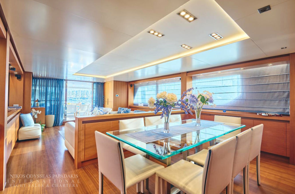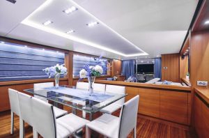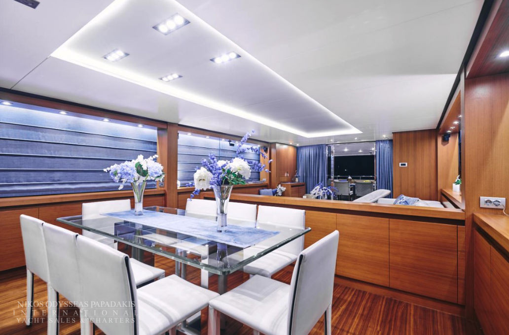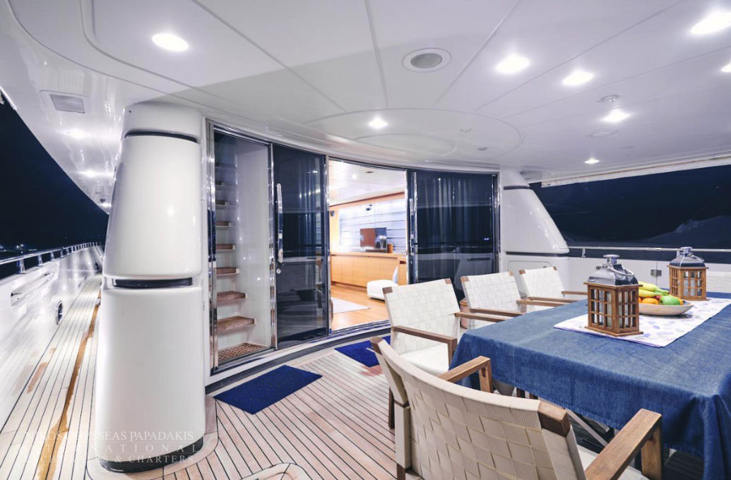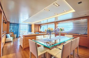 • Main Deck: Large saloon area, dining area amidships, and a fully equipped galley forward. The aft deck includes a dining area for al fresco meals with guests.
