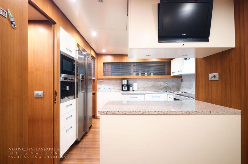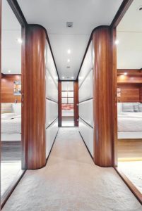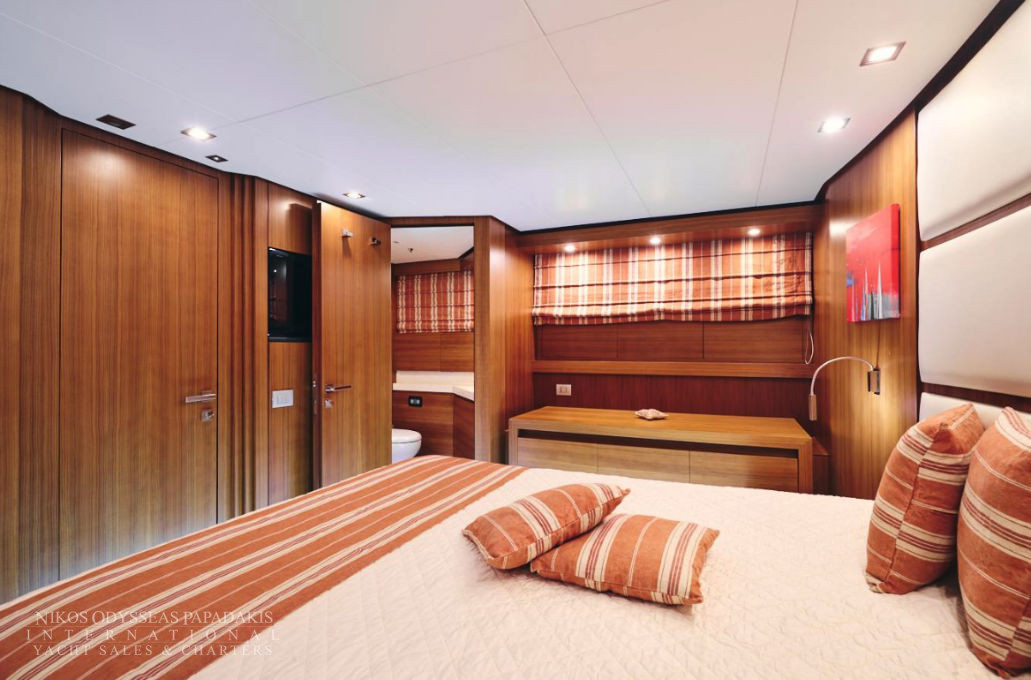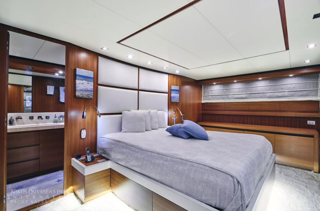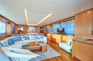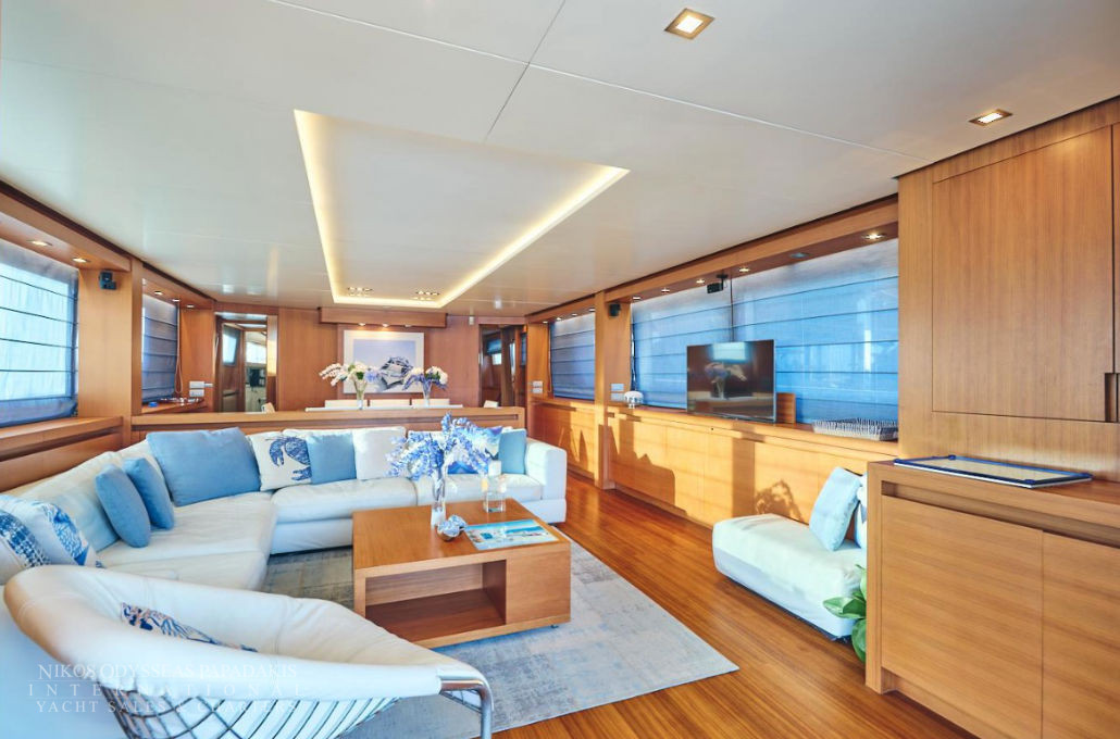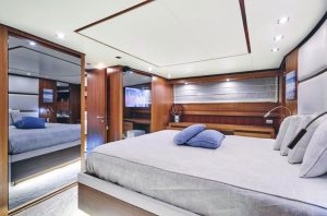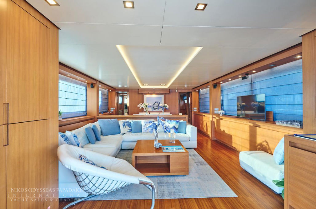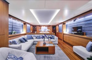 • Interior Design: The yacht boasts an elegant interior characterized by light fabrics, leather upholstery, and chrome and stainless-steel accents.